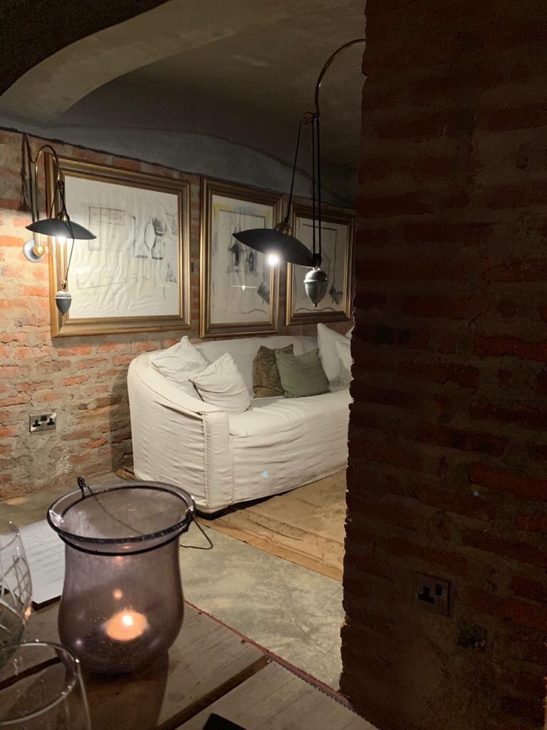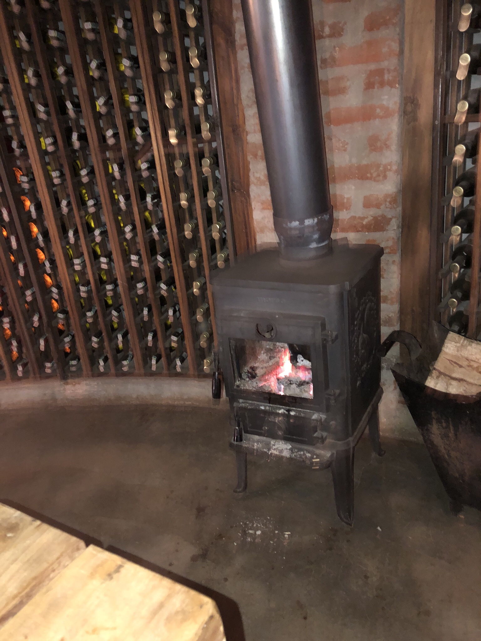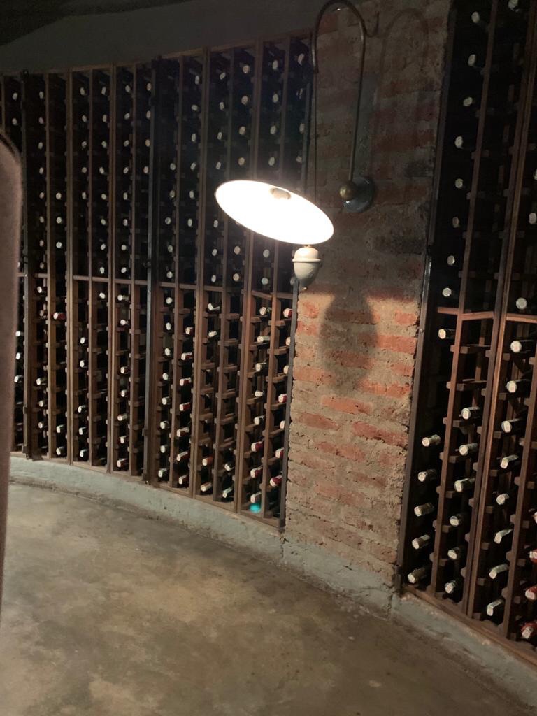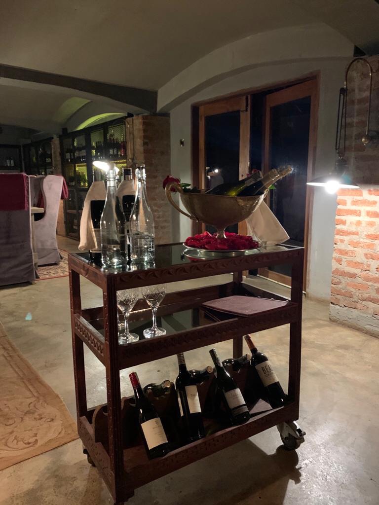 We rested a while , still absorbing the torch dance experience . We decided to have an early dinner . As we walked out for dinner one of the butlers told us that the we were requested to have a glass of wine at their wine cellar . Happily we tripped down to the cavern like wine cellar adorned with a nice fireplace and wall arrayed with expensive wines .