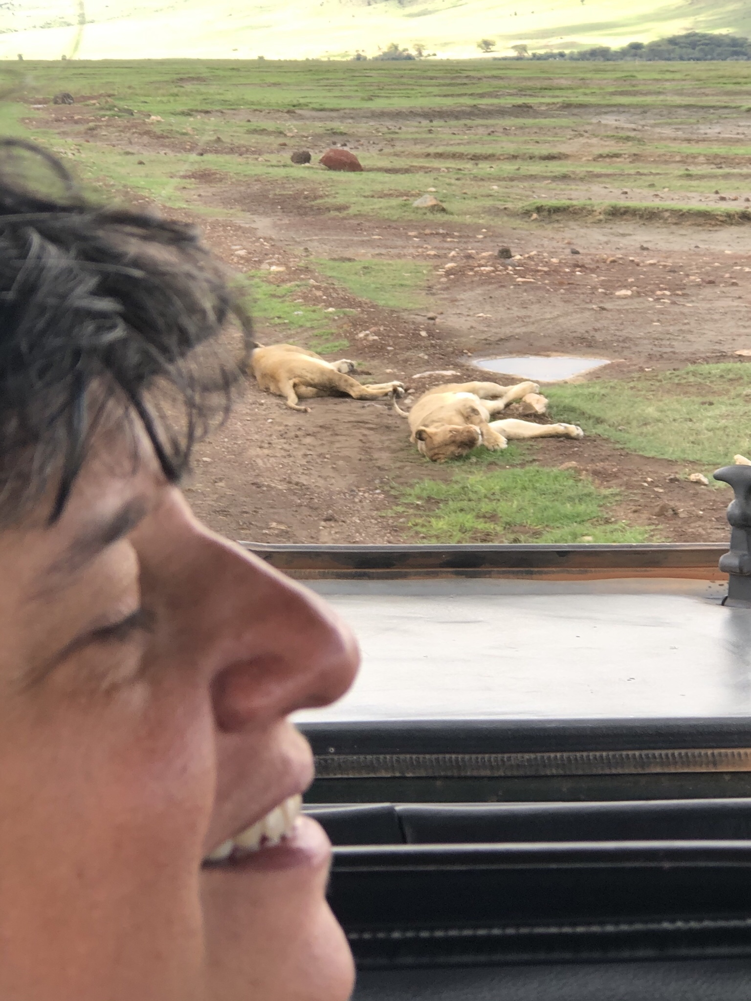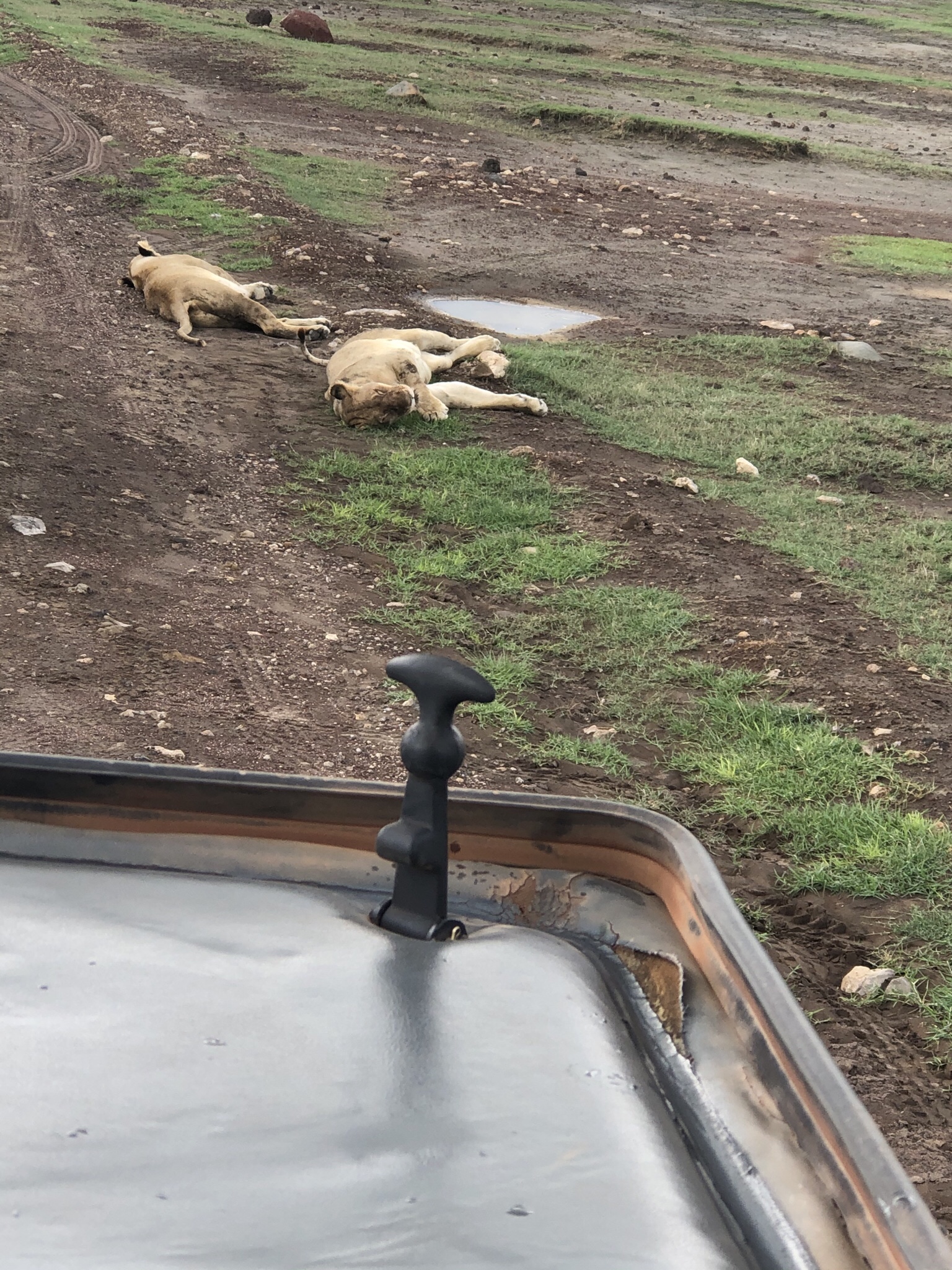 The wind had picked up speed and by the time we drove to see the flamingoes in the lake it started pelting with rain . But just before the rain set in , three lions by the roadside , doing what all good lions do , sleeping . We managed to take selfies with the lions before we carried on .