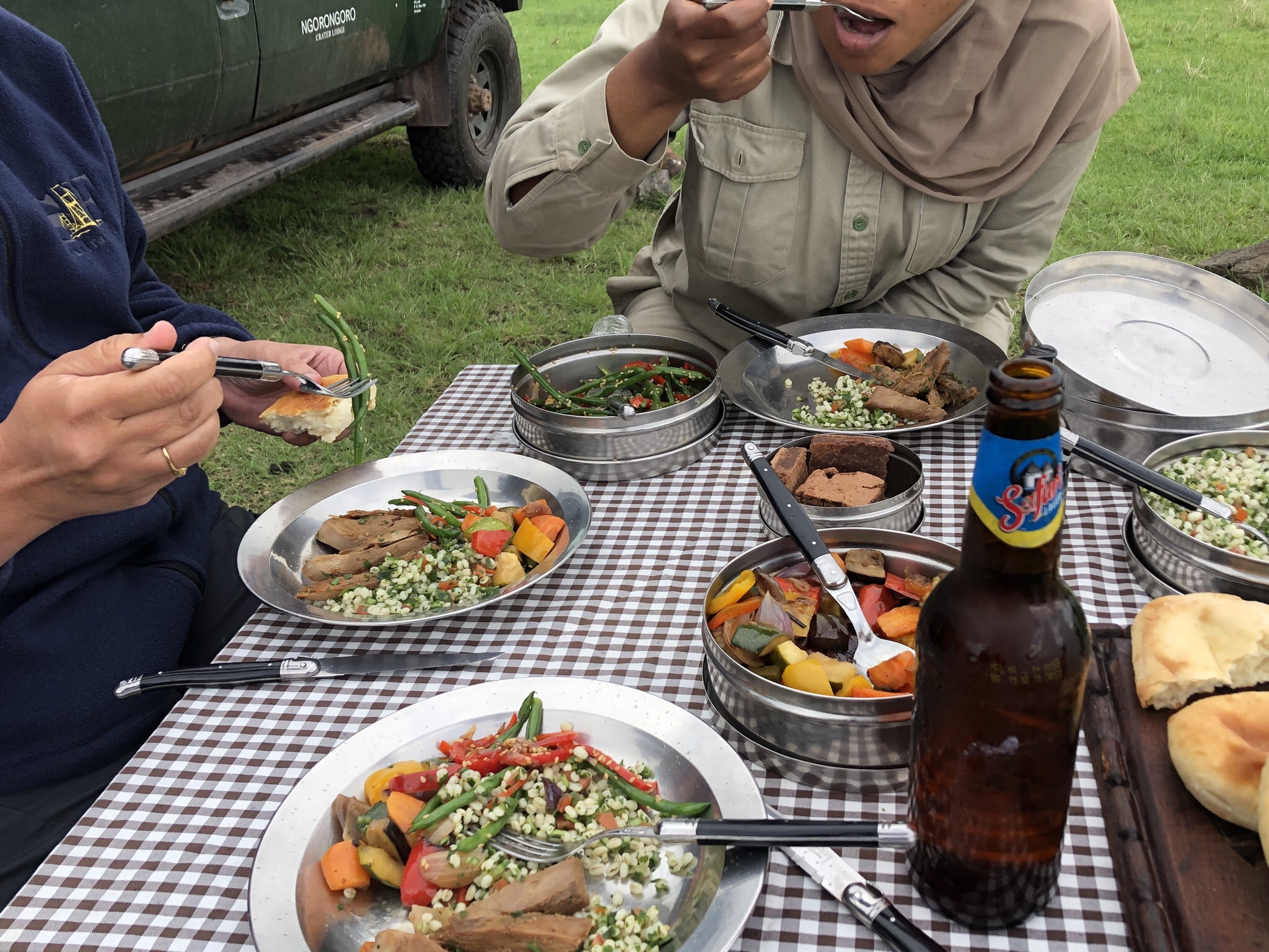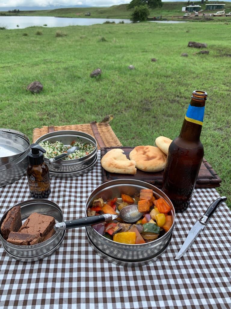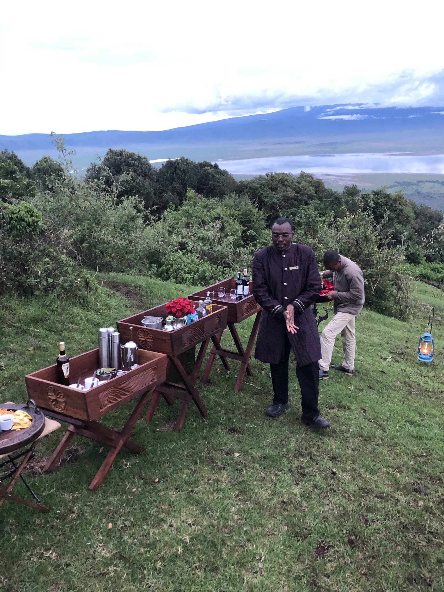 On one side a full scale bar with hot and cold snacks were ready to be severed by the hospitable service team . Promptly a bottle of champagne was opened and we sat down to enjoy the evening , the cold glass of bubbly and the hot delectable kebabs . In the distance , the crater floor and the lakes were still visible .