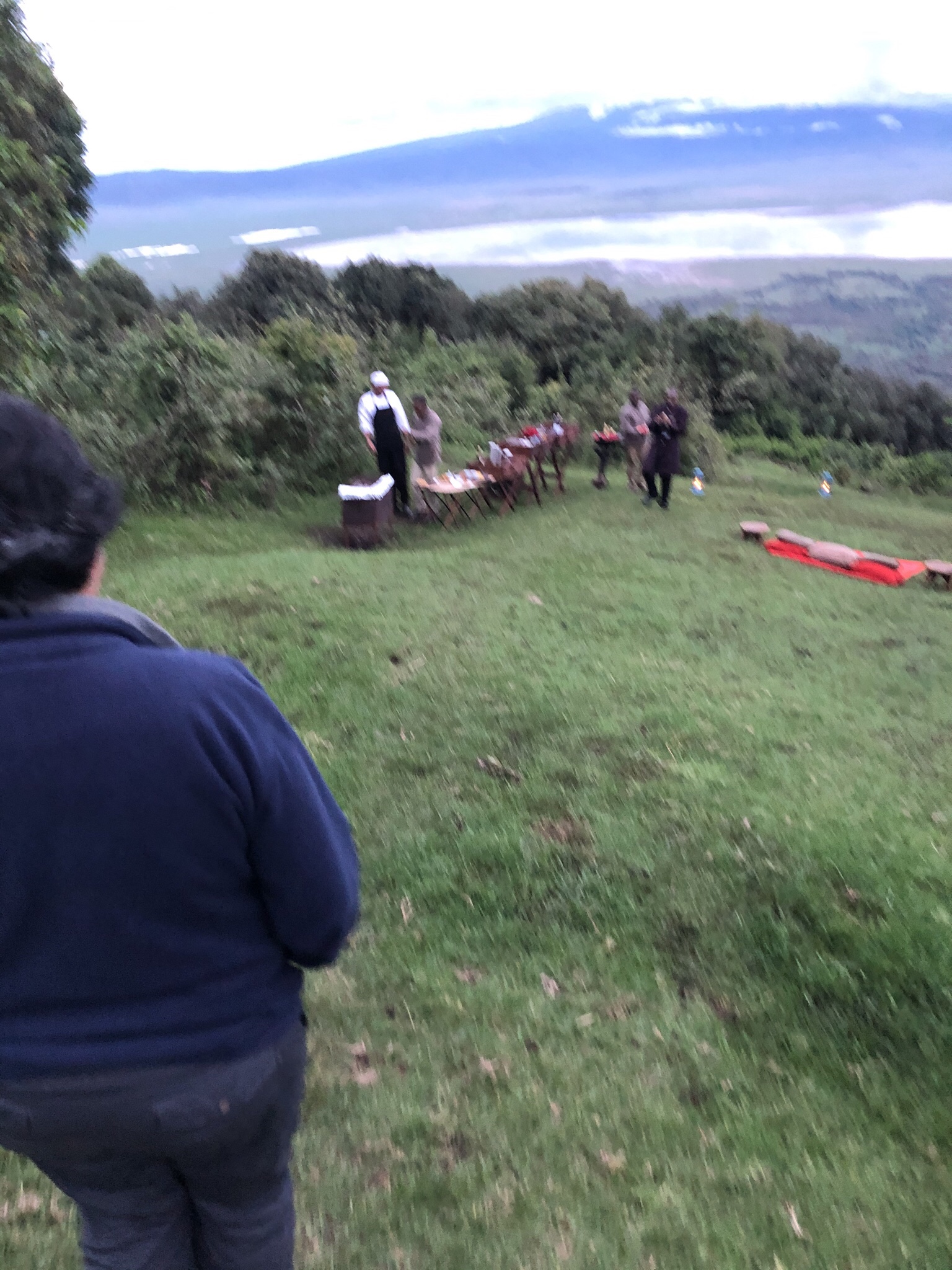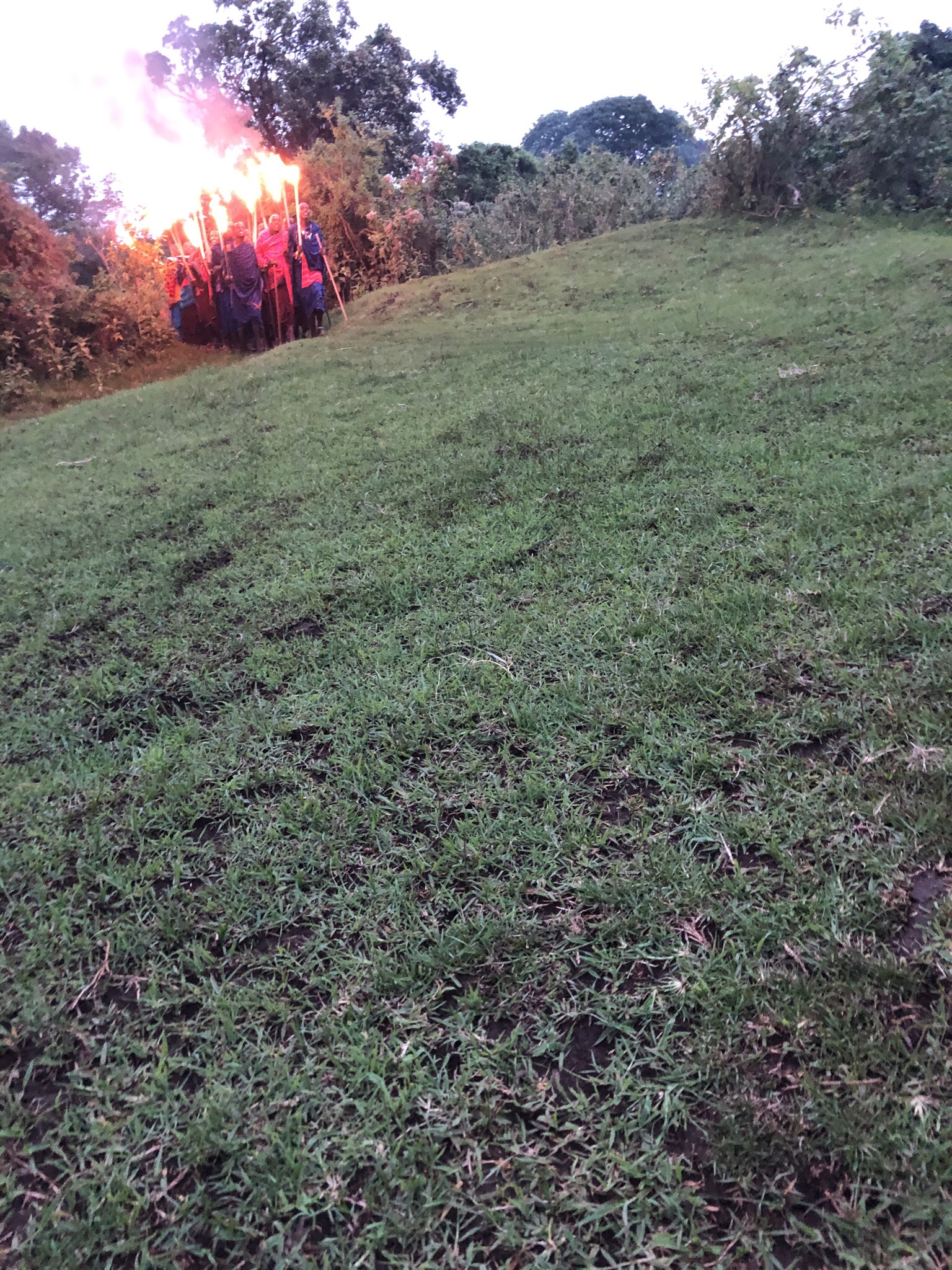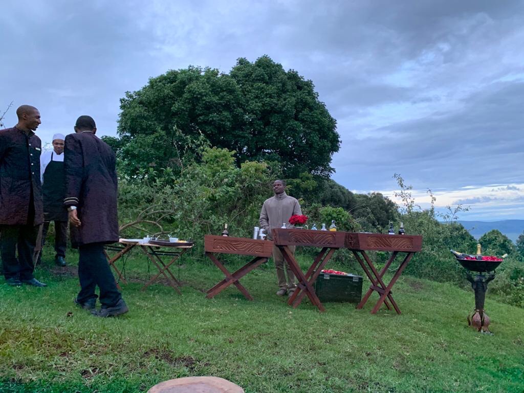 We were escorted by Daniel and M’ssisi , our butlers to a large open sloping glade a little further down from the cluster of our ‘ huts’ !