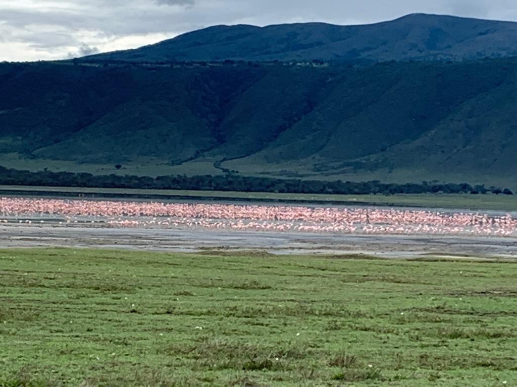 We left the marsh and drove back in order to see the flamingoes on one of the large lakes on the left side of the crater . It seemed that the lesser flamingoes had decided to migrate locally to the lake after the rains from Lake Naturon where they bred .