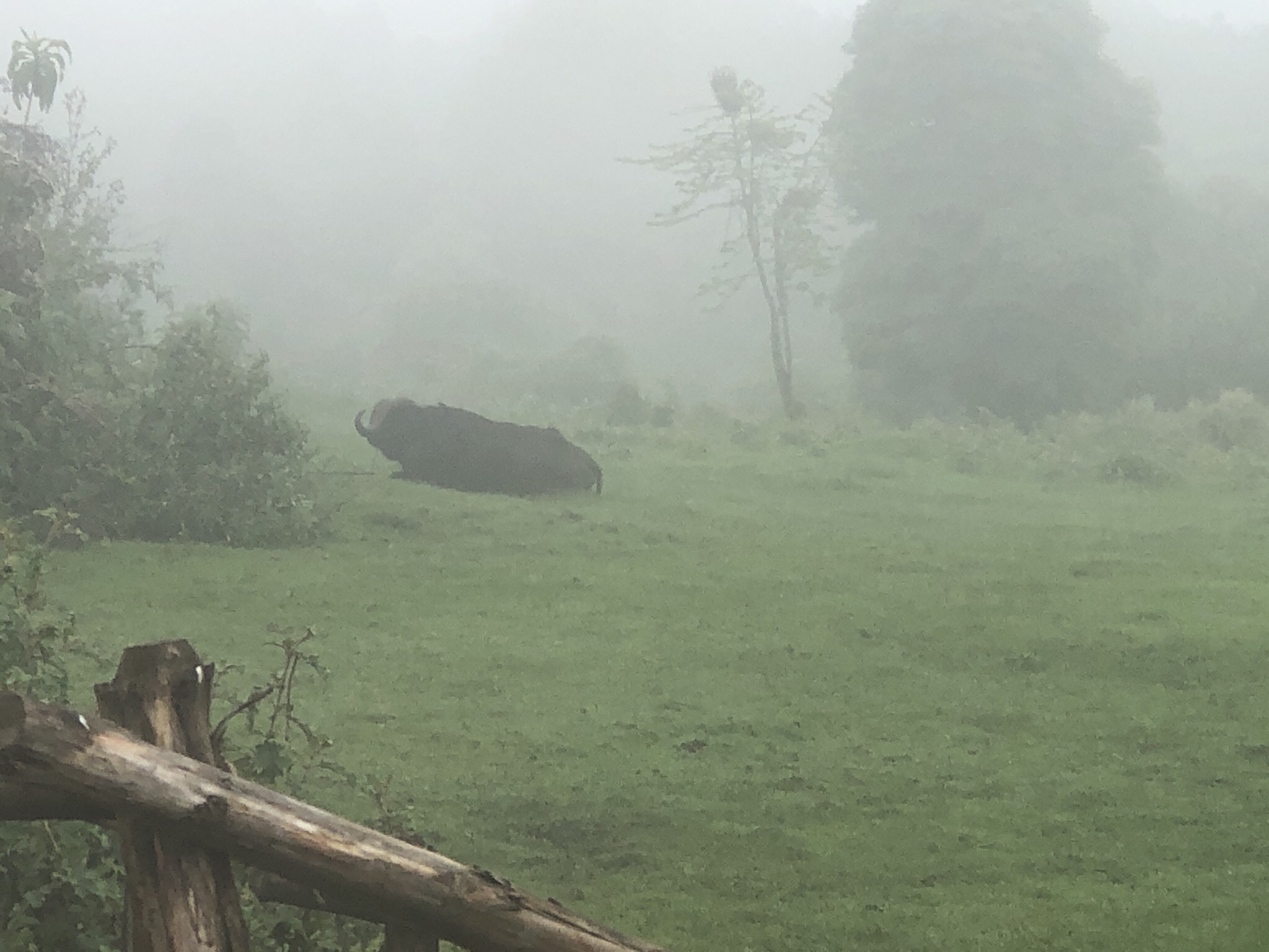 Outside in the lawn , a wild buffalo sat in the mist , like a sculpture Japanese stone garden , immovable and mighty .