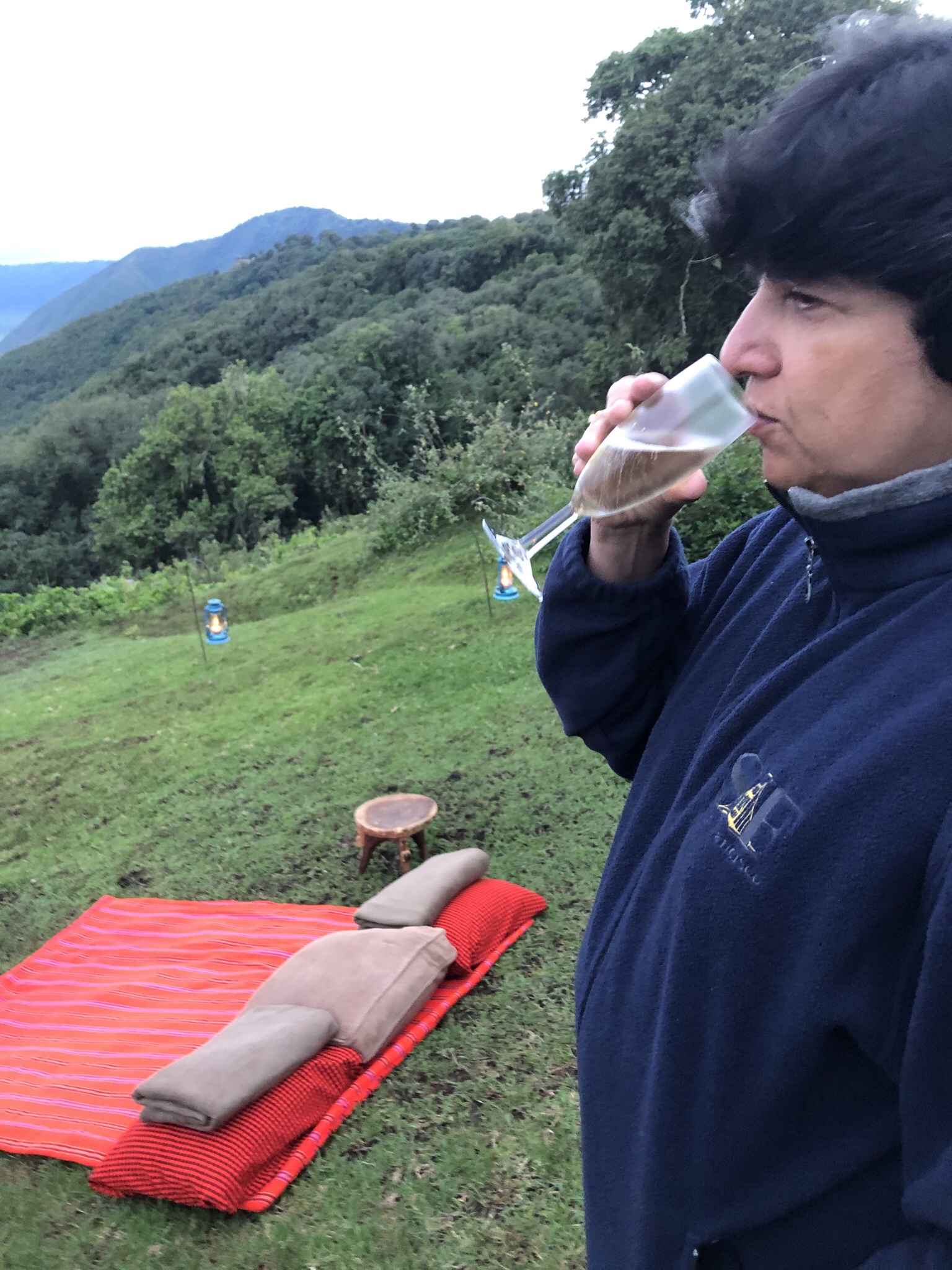 There in the center of the steeply sloping grassy lawn , a red dhurrie with comfortable cushions and small settees had been arranged for us to recline on !