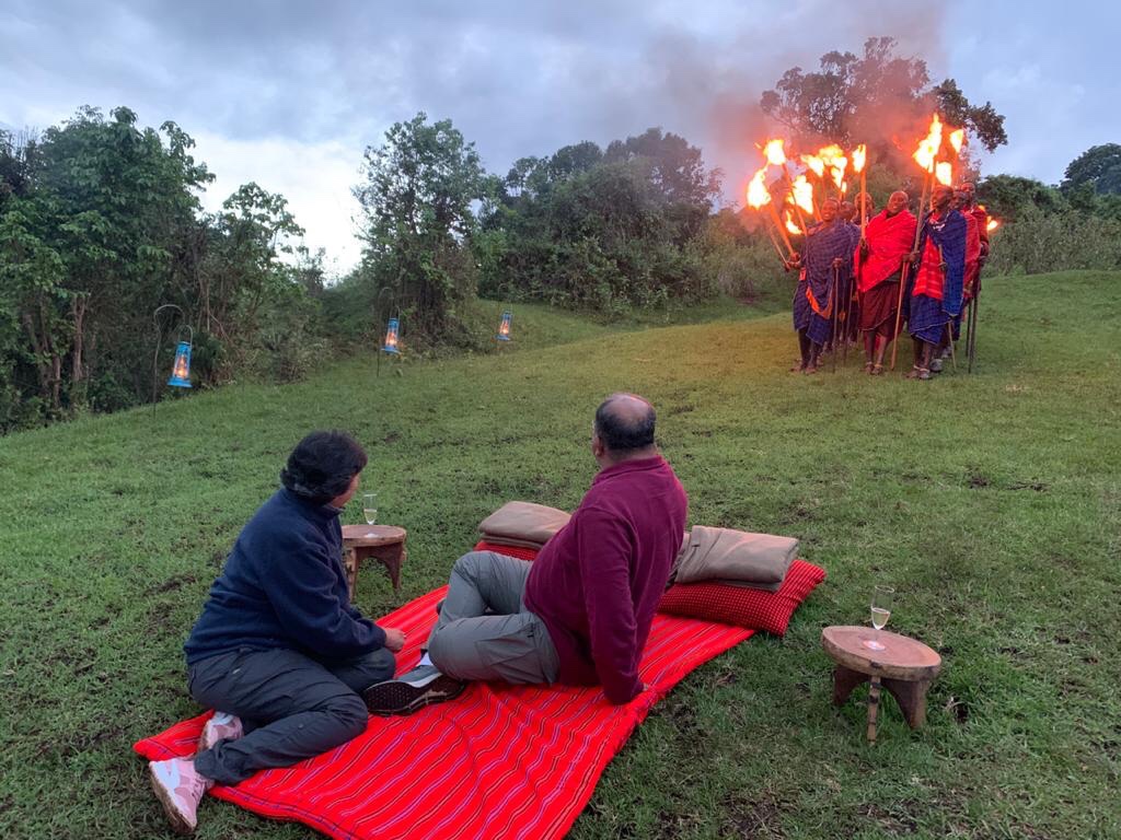 We had barely settled in when Surprise , Surprise ! We started hearing a deep chanting noise interspersed with sharp cries and ululation’s ! Breaking the evening gloom , a troupe of Masai’s were making an absolutely dramatic entrance . For in their hands they held burning torches / masahals , the flame leaping high in the sky . The men were dressed in typical Red Masai robes , glistening jewelers around some of their necks , sticks and torches in hand , the women dressed in black and red upper robes with blue bottoms or black and ochre robes, adorned with thick flat white rings around their necks with a necklace to top them , just looked beautiful . It was possibly one of the most arresting performances we had been privileged to see.
