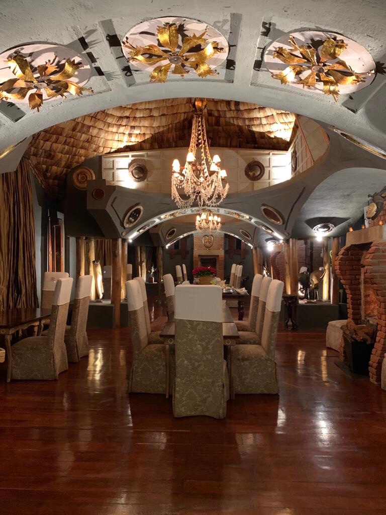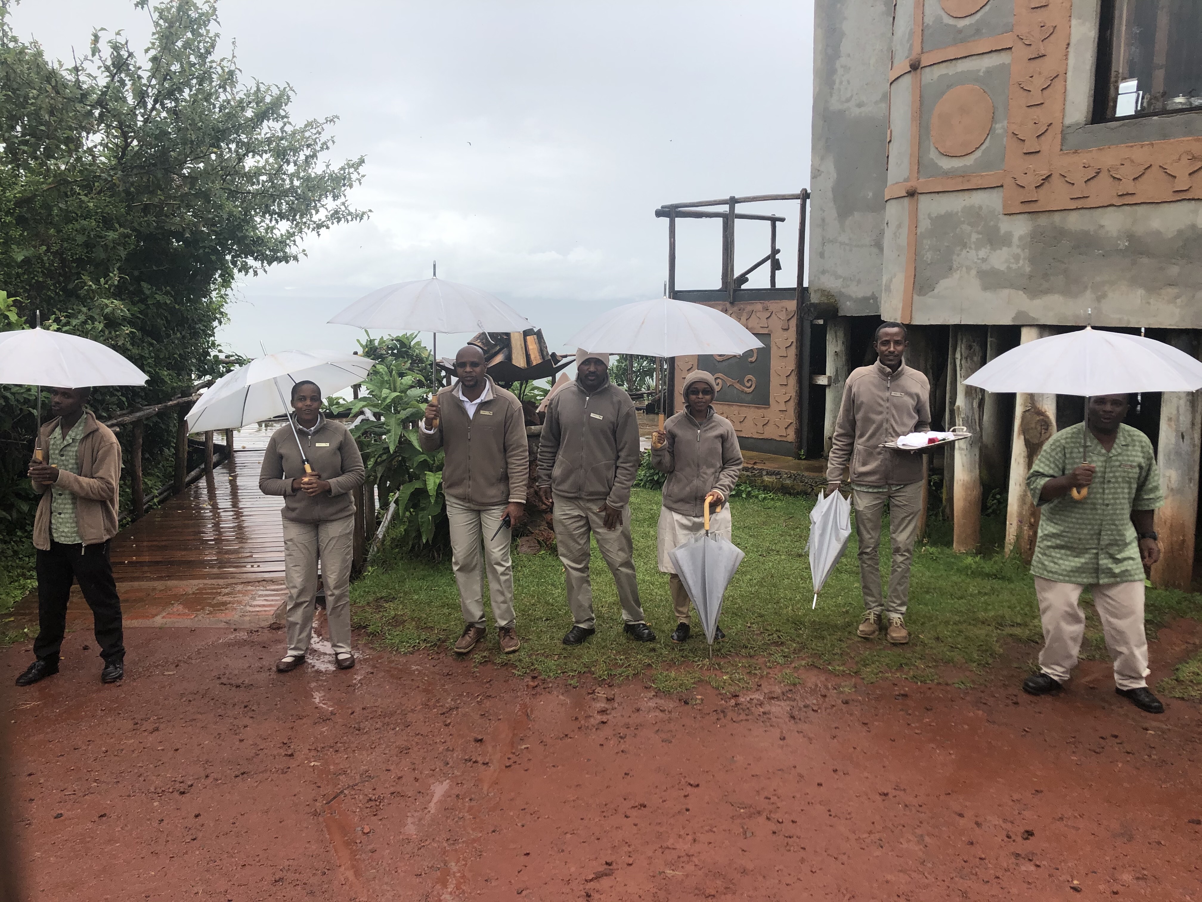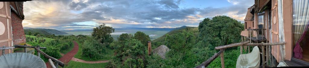 Further up , there were several spots from where one could look down into the caldera but we were in a hurry . We reached the Lodge around noon , amidst a mild drizzle , where we were met by Kyle the manager and his team including our butlers Mssisi and Dennis . After the usual warm welcome , we were shown to our rooms , bypassing the beautiful reception and restaurant area .