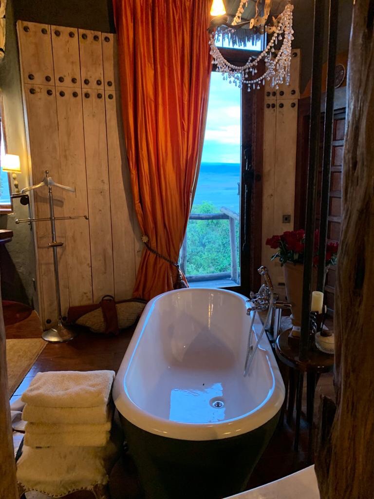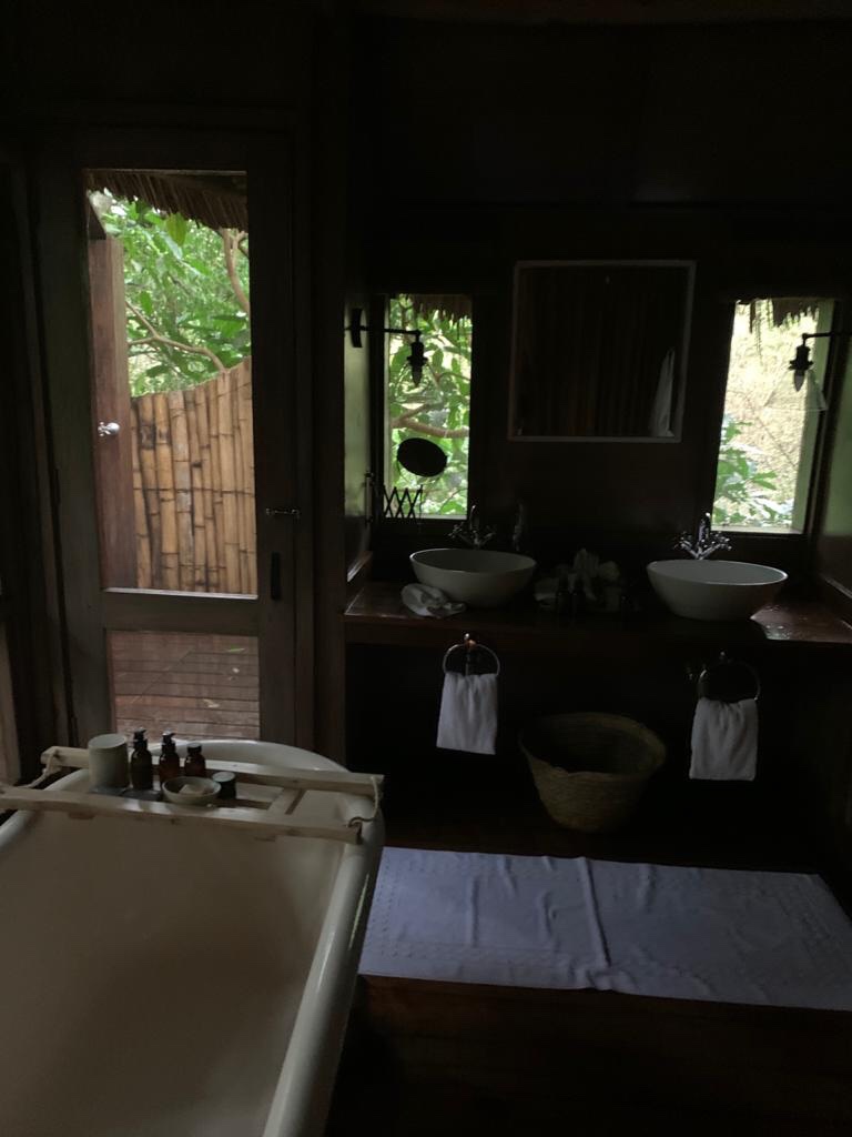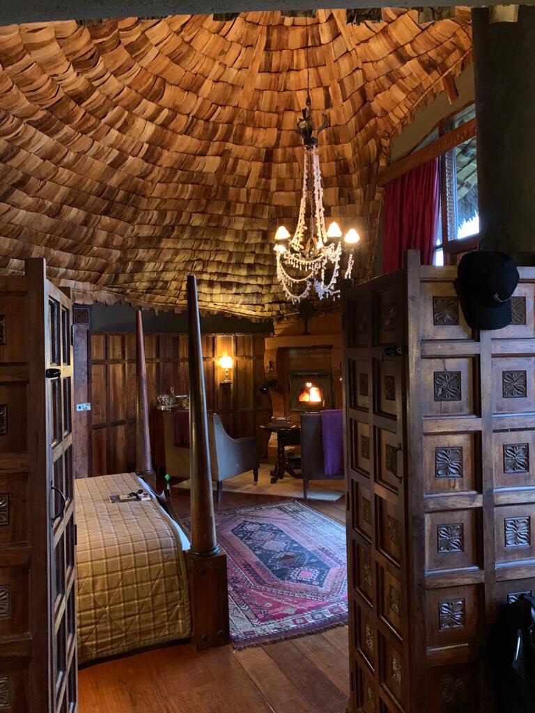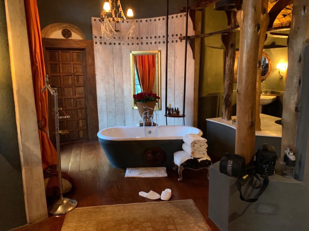 We had a huge suite to ourselves . Luxuriously appointed the rooms main features included a wonderful wood fired antique fireplace , a magnificent four poster bed, a large Victorian bathtub in splendid isolation , ornate mirrors , heavy purple drapery , dressing tables , umpteen places to charge our cameras and phones , a large step out balcony with splendid views , different basins for each of us and. A shower area , thick plush carpets and colorful throw rugs . The walls and floor were wooden while the rooftop was made with dried plaited plantain bark .