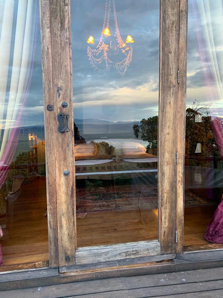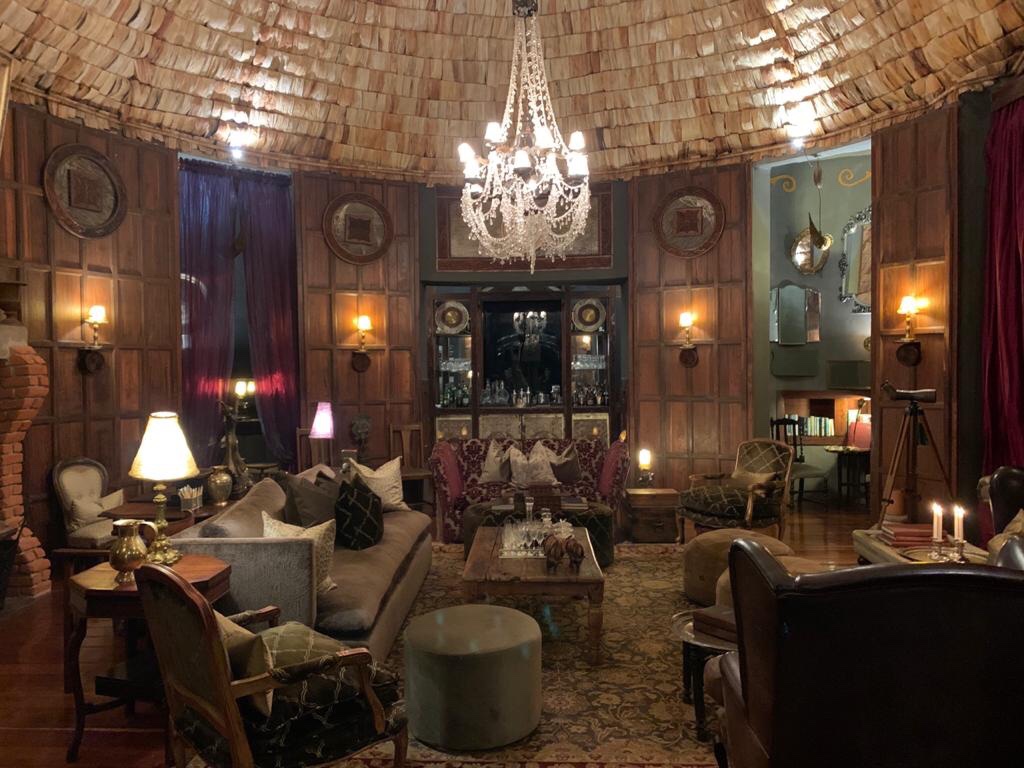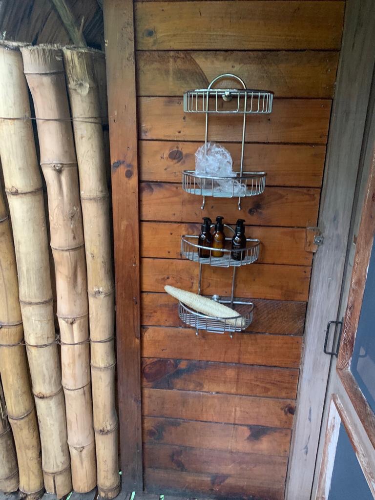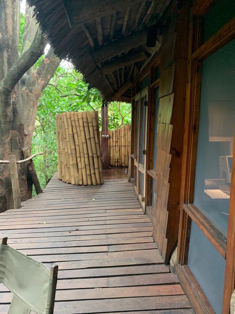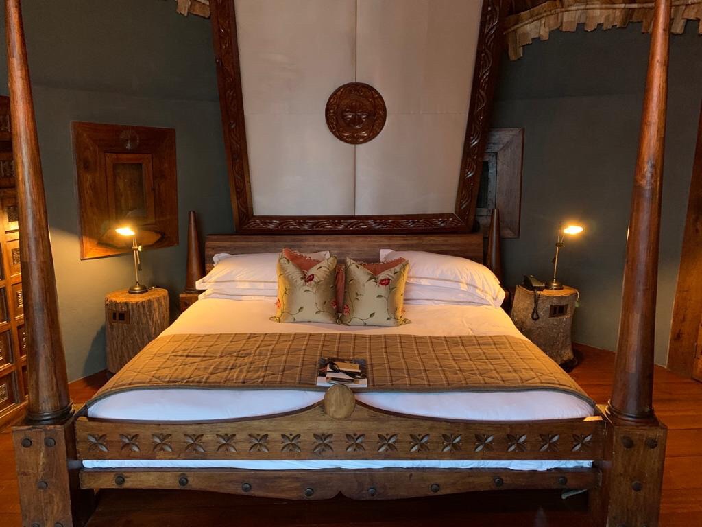 We had a huge suite to ourselves . Luxuriously appointed the rooms main features included a wonderful wood fired antique fireplace , a magnificent four poster bed, a large Victorian bathtub in splendid isolation , ornate mirrors , heavy purple drapery , dressing tables , umpteen places to charge our cameras and phones , a large step out balcony with splendid views , different basins for each of us and. A shower area , thick plush carpets and colorful throw rugs . The walls and floor were wooden while the rooftop was made with dried plaited plantain bark .