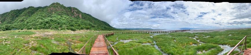 On the last leg of our journey in Lake Manyara , we again came to the Marsh where we had last been met with gale force winds and driving rain on the day of our arrival . There was road block on the way . A Large buffalo was slowly and imperiously chewing cud , blocking the narrow road with nary a care in the world . Tourists clicked away while the wild beast did not give a fig . It slowly eased itself Into a nearby marsh and promptly sank to its shoulders .