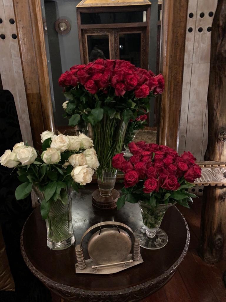 This area was fairly spectacular . Large mirrors fronted with long stemmed roses in vases greeted us . Plush low seating and many books , nooks /corners with tall armchairs , round gilt edged mirrors , small marble tables , heavy drapery of rich cloth and curtains held back with tasseled ropes , a fire place and library on one side completed the ensemble . A spectacular bar next to it , a library and small niches tucked away with hide aways for an intimate tete-a-tete , contributed to a rich and opulent decor .