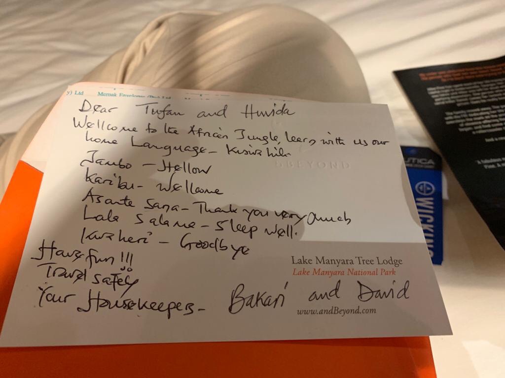 The housekeepers left a sweet handwritten note in our room on the last night which read ‘ Welcome to the African Jungle . learn with us our home language – Kiswahili.