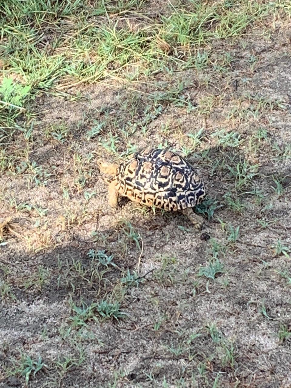 A Small Leopard tortoise virtually running flat out, crossed the road and into