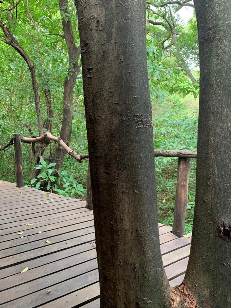 Zakia , knowing that we loved birds , decided to take us to the Lerai forest as it was starting to get dark . The Lerai forest consists of giant ficus trees , and acacia trees . The Feverbark acacias have gnarled knobby bark upto a height , where elephants can reach ! This yellow green tree uses this clever defense to ward off elephants from smashing their bark .