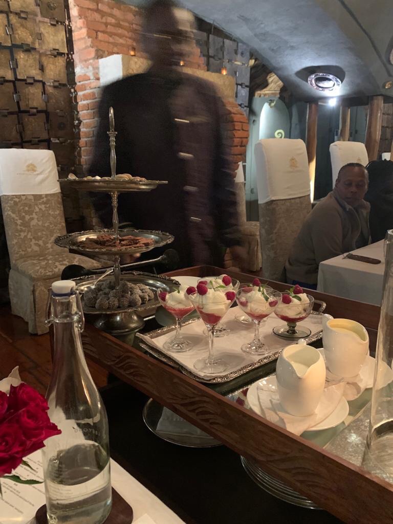 A couple of AndBeyond travel agents from Tanzania joined us . A couple of drinks down , we felt fortified enough to have our dinner . Dinner was a four course deluxe meal .