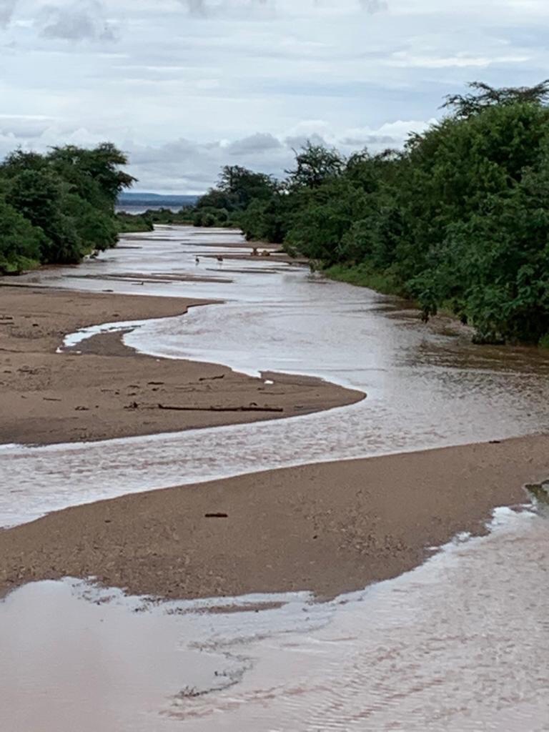 We were crossing a bridge when suddenly Hussein said ‘ Lions ‘ ! Sure enough a pair of lionesses we’re sitting on the sandy banks of the stream maybe 75 yards away , sitting alert and in the look out for pray . Some Warthogs rooted around not very far away , the lions looked at them hungrily , licking their chops, but possibly a little too far away to launch an attack .