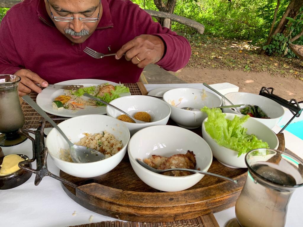 Abdullah promptly sent a young man called Ali Sharifa to us , who duly announced that he was the designated ‘ Monkey Scarer ‘ and that he would ensure that we would have a peaceful lunch ! Under the watchful eye of the monkey scarer , we had a light repast . Abdullah served us with grace and attention to detail , all accompanied by a beaming smile .It was the perfect antidote to the adrenalin rush from the elephant incident .