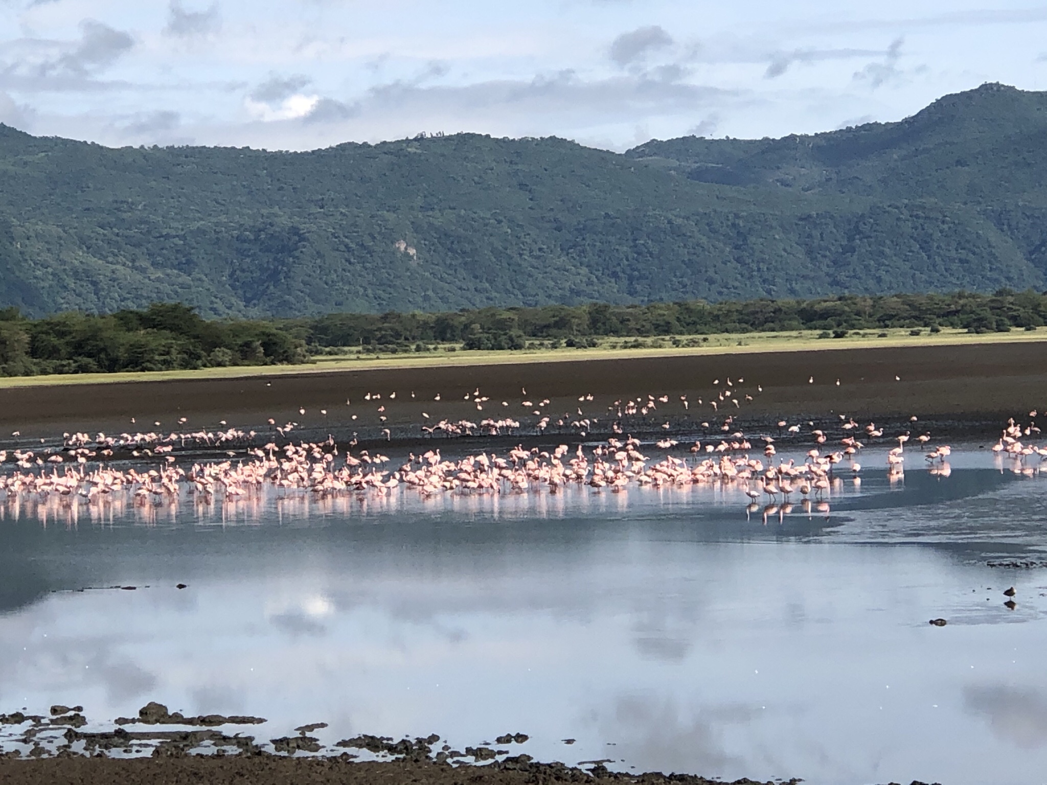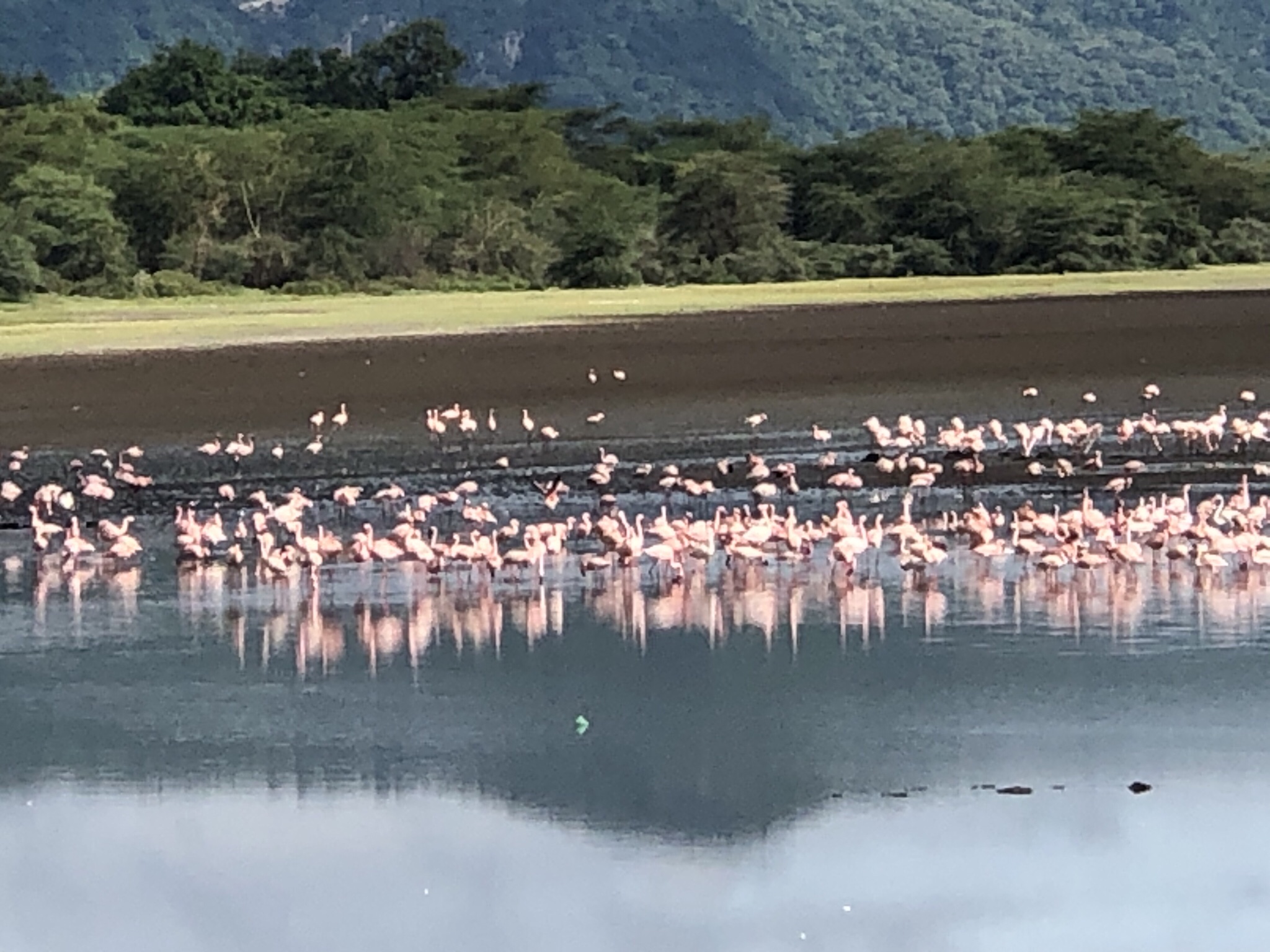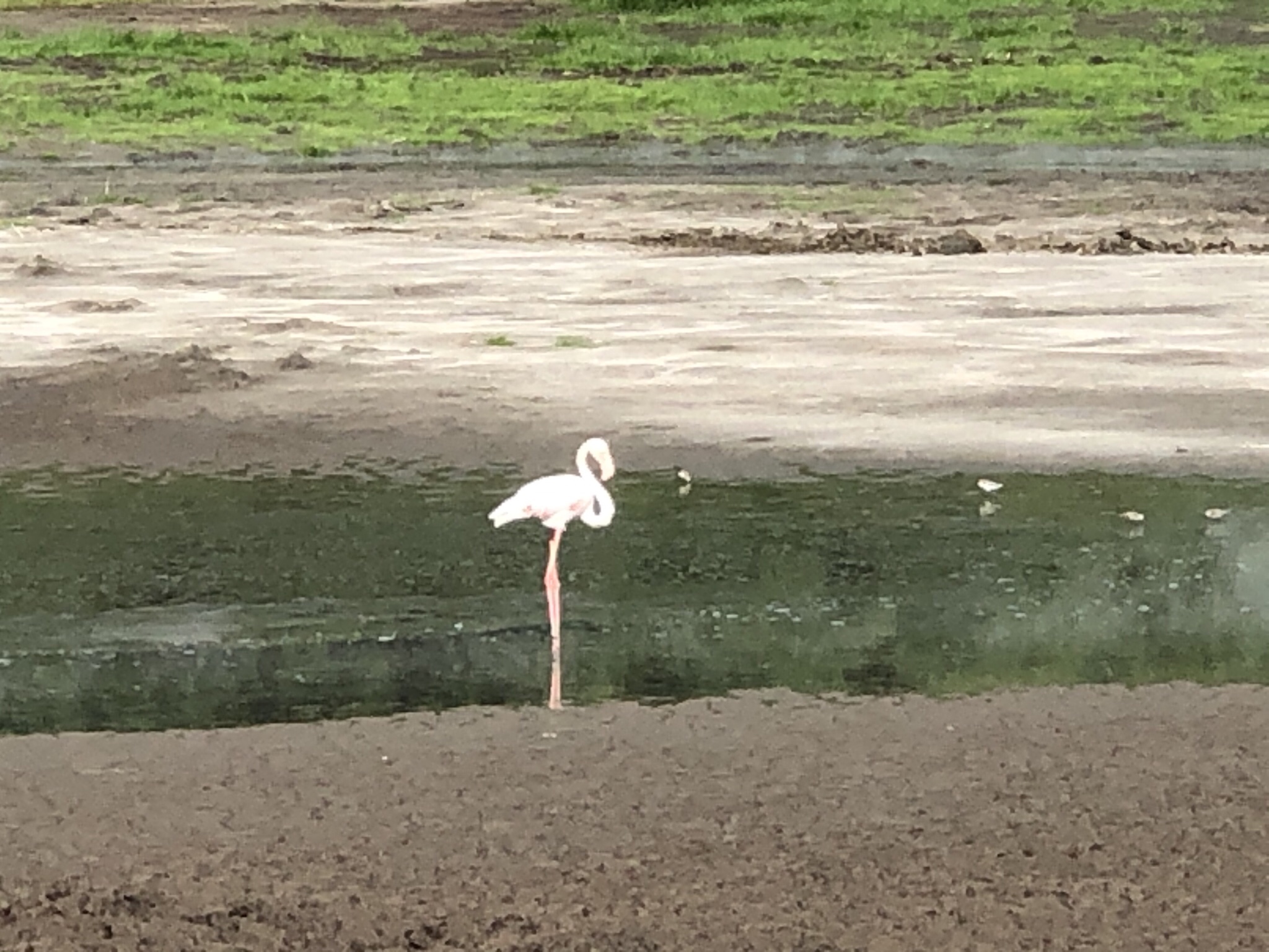 Ere too long , we came across three of our old friends the Southern Ground Hornbills . With red wattles , these big birds can fly , but spend most of their time on the ground . Surprisingly they can live up-to sixty years and mate for life . Their rate of reproduction is slow and produce only one baby a year . Yet they were thriving in Lake Manyara . We searched for the elusive leopard but to no avail . We stopped at the hot water pools and the afore mentioned picnic spot . While Hussein set up our breakfast we walked down by means of a long wooden trestle bridge , constructed over the hot springs and the shallows in a zig zag manner , about two meters above the ground , to get up close and personal with the flamingoes .