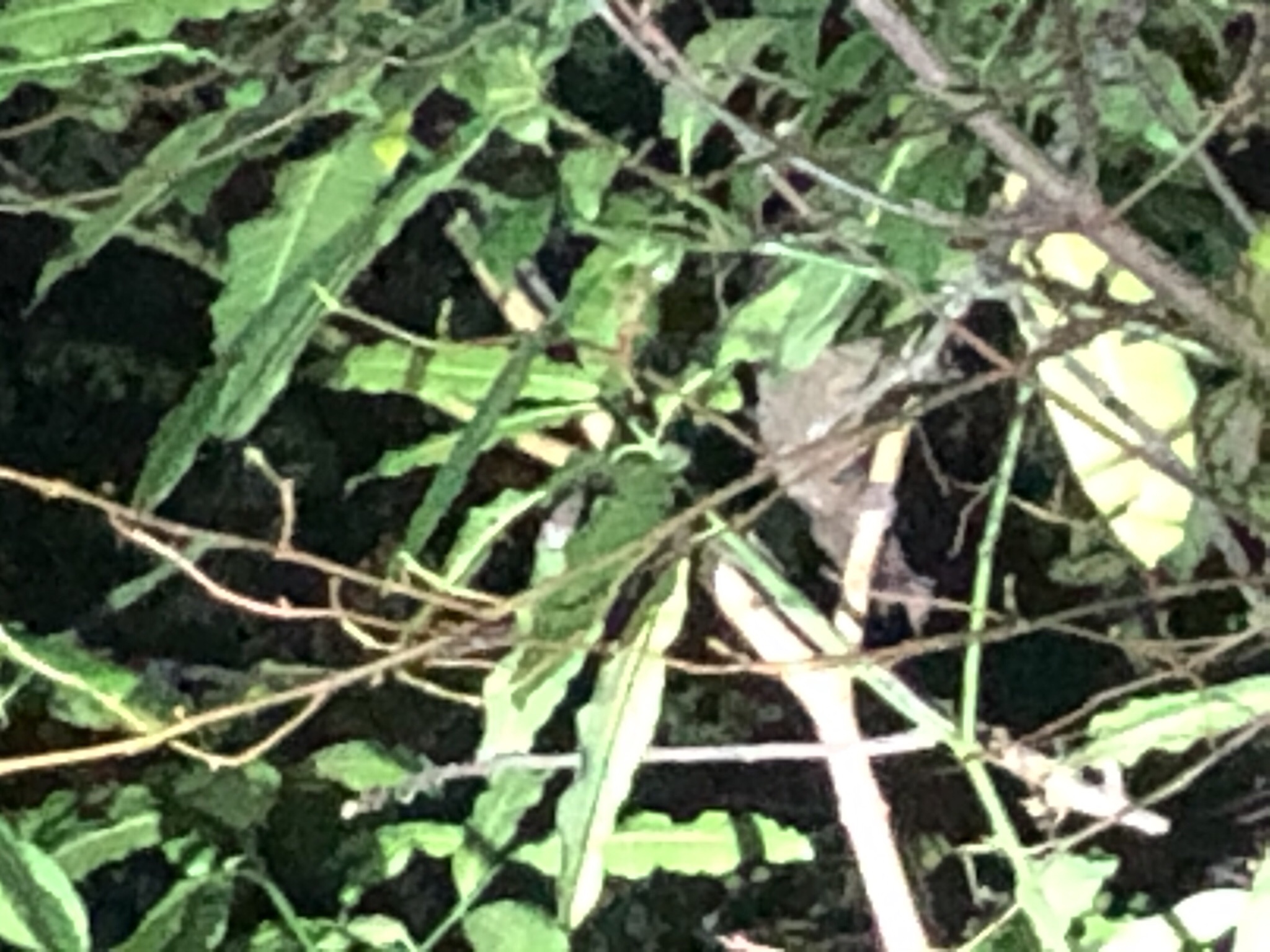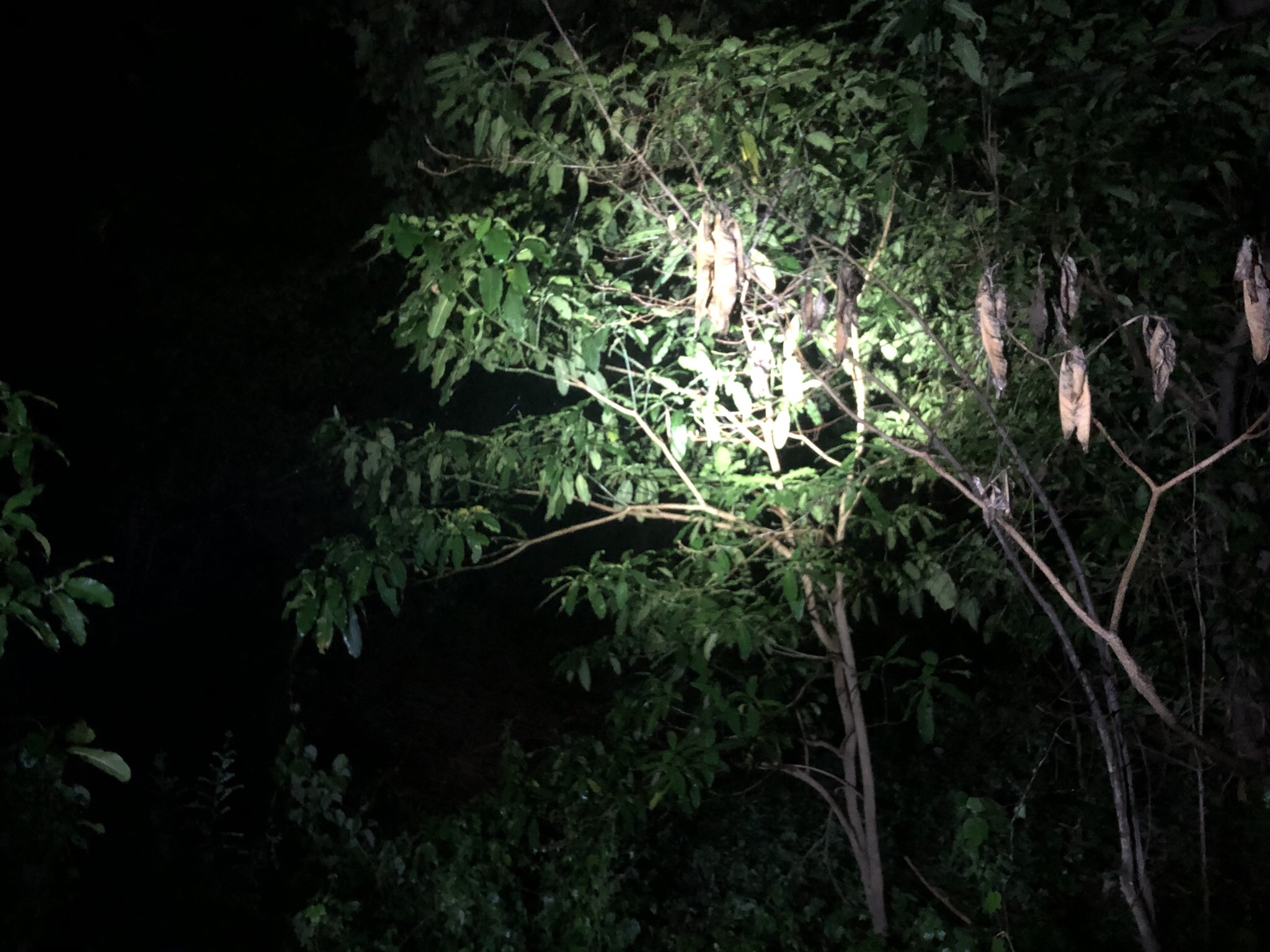 As we settled down , Khoi Khai managed to shine a light in the gloom and picked up a Flapped Green Chameleon , holding on tightly to a branch , looking like a little green gnome . This Chameleoon, active nocturnally ,froze in the light ,hoping to avoid detection.