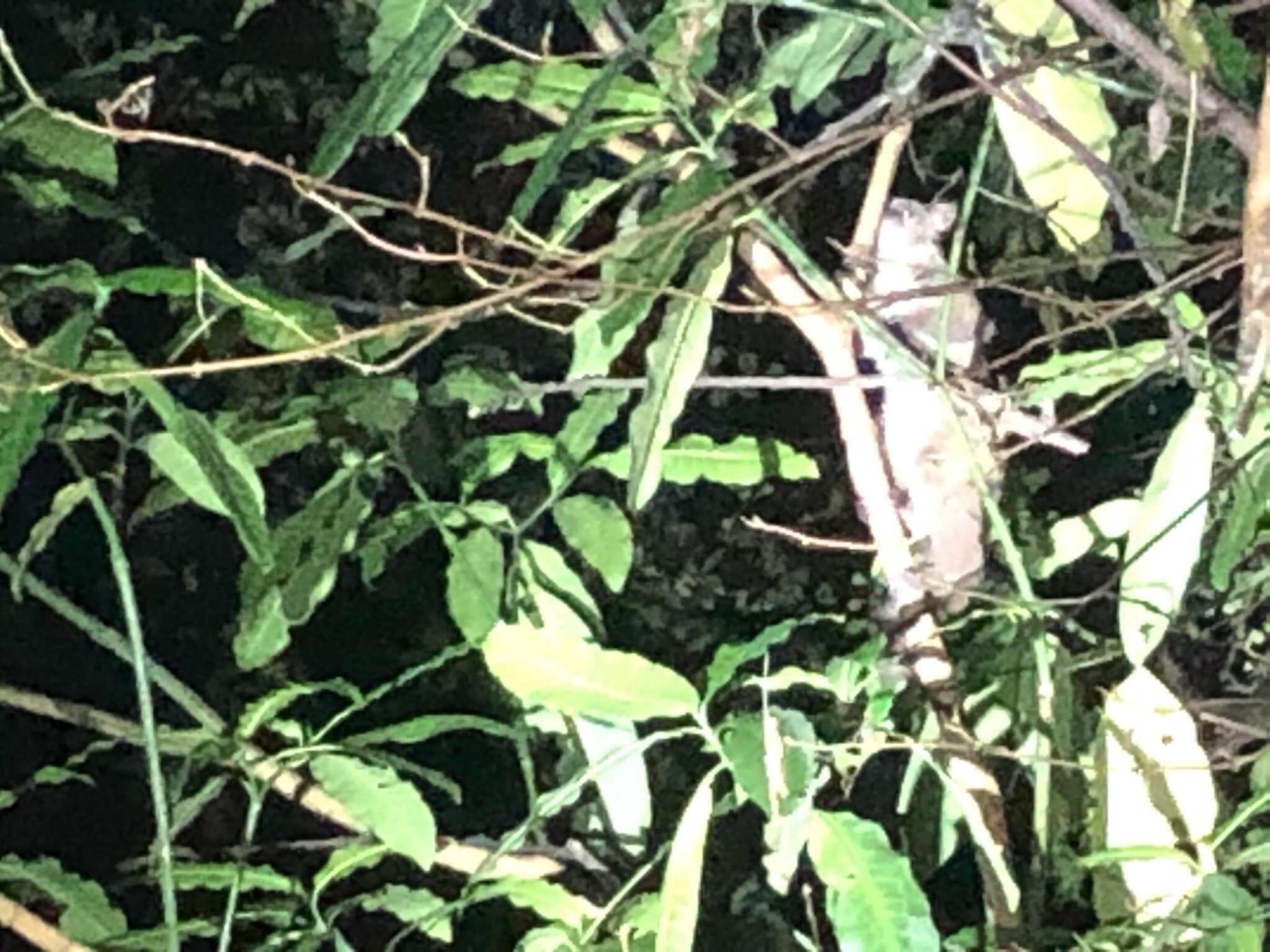 Our night animal spotting started even before we reached our vehicles ! For Abdullah shine his torch into the trees as we walked up to our vehicle , at a strange sound , like a baby been strangled. In the torch light , we sighted a bushbaby creeping along amongst the branches . The white furred bushbaby has a prehensile tail with a strong grip and fingers which looked very human . With its huge bug eyes it looked most strange ,and to many an African would have been a embodiment of the spirits that animated the forests at night .