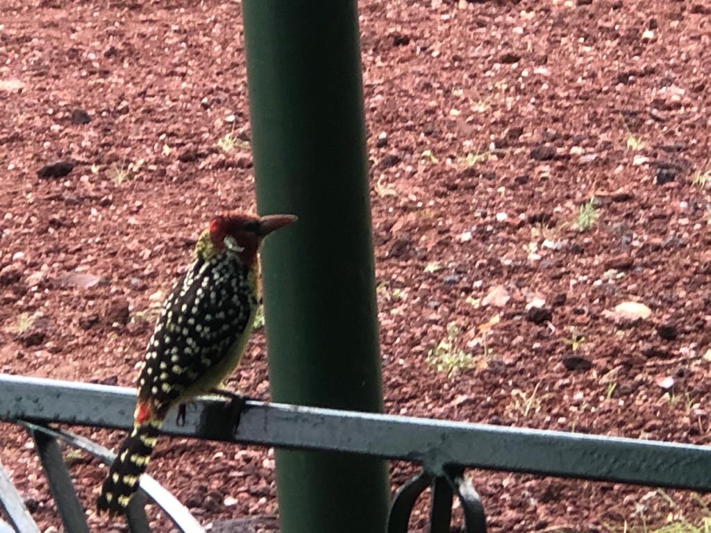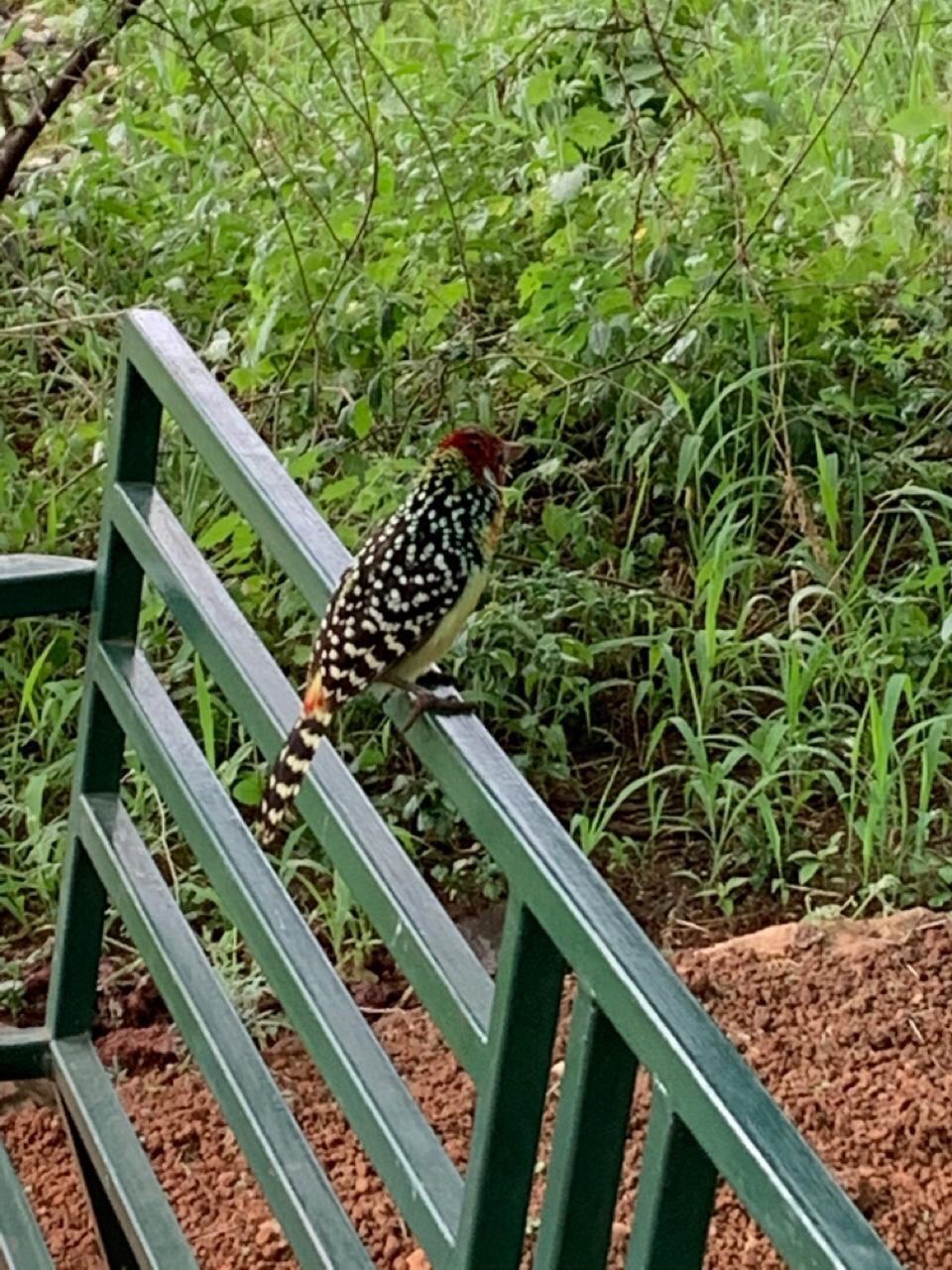 During our picnic lunch some amazing looking birds , quite tame , started visiting the lunch table in search for food . A red and yellow barbet which looked so colorful that one could have mistaken it for a toy and just beautiful set of weavers .