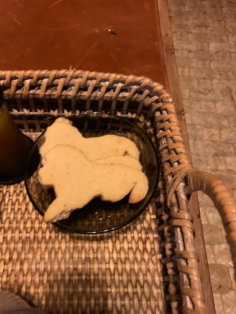 We were escorted by the Masai warrior for dinner . We perched ourselves high above the ground , around bar . We were frozen gin and tonics whilst we munches on large green olives and beetroot kebabs and other dainty snacks . Abdullah , now resplendent in his stewards gear served us with aplomb .