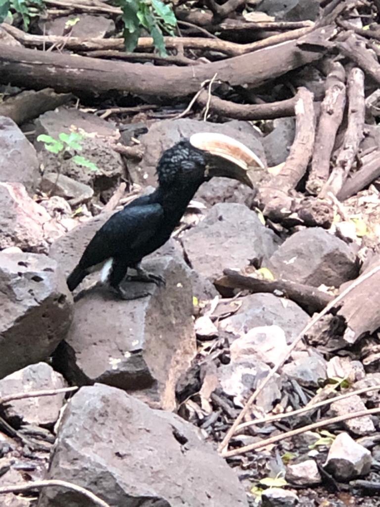 As we entered the park we saw a beautiful hornbill – the Silver single casqued hornbill flying around in pairs . This part of the forest called the Groundwater forest is crisscrossed with clear streams of water bubbling from underground aquifers , and is filled with wild mango trees and fig trees . This was an ideal environment for the hornbills .