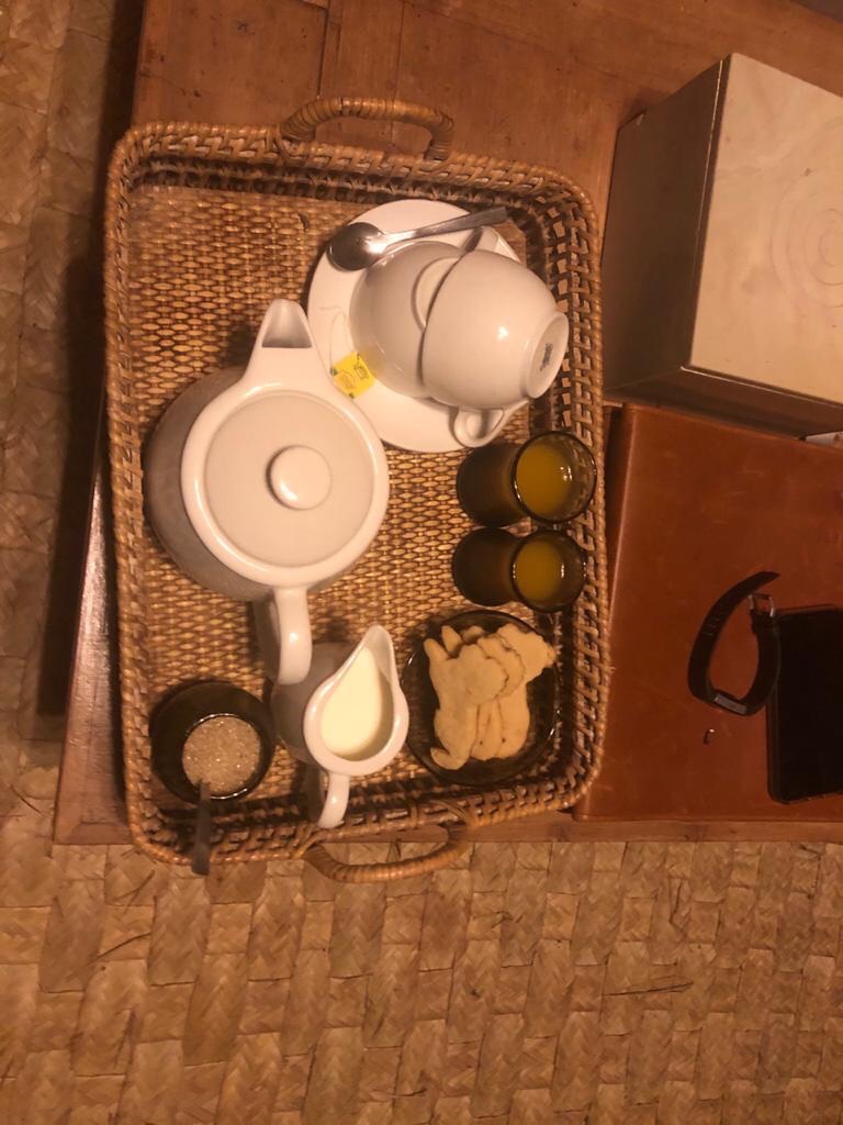 Our room was huge with a large sitting area well appointed with wooden furniture and then a large four poster bed . The ceiling we later learnt , was made from Plantain bark ..Our bathtub was already drawn up with hot water and candle lit . After wallowing like a hippo in our hot water tub , one was happy and content . The hot water bath was really welcome after the whole day’s tiring journey .