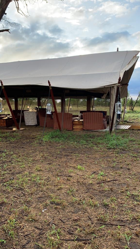 A roaring campfire was in place for the guests to gather around . With a couple of drinks in our hand , we waited for Daniel as he had promised that he would tally our birds and animals before we left from Serengeti Under the Canvas .