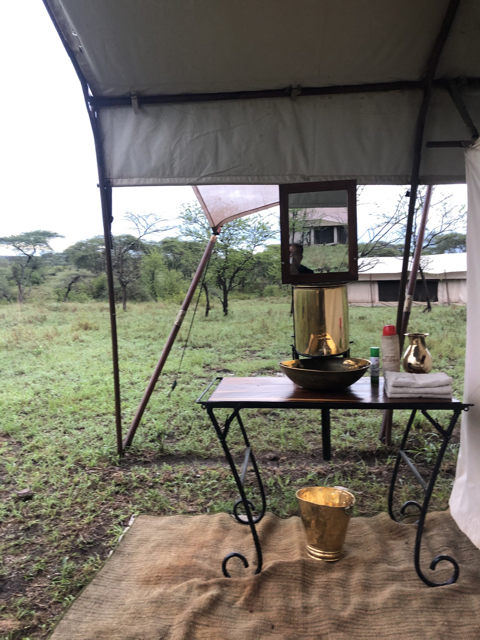 Inside the tent we had a wonderful large bed , copper bound wooden chests , carpeted floor , and plenty of space to arrange our luggage and hang out clothes . The wash area had a mirror and copper basin with water pouring into a beautiful brass urn , a commode over a wooden platform and a wonderful alfresco bathing area at the rear , open to the sky .