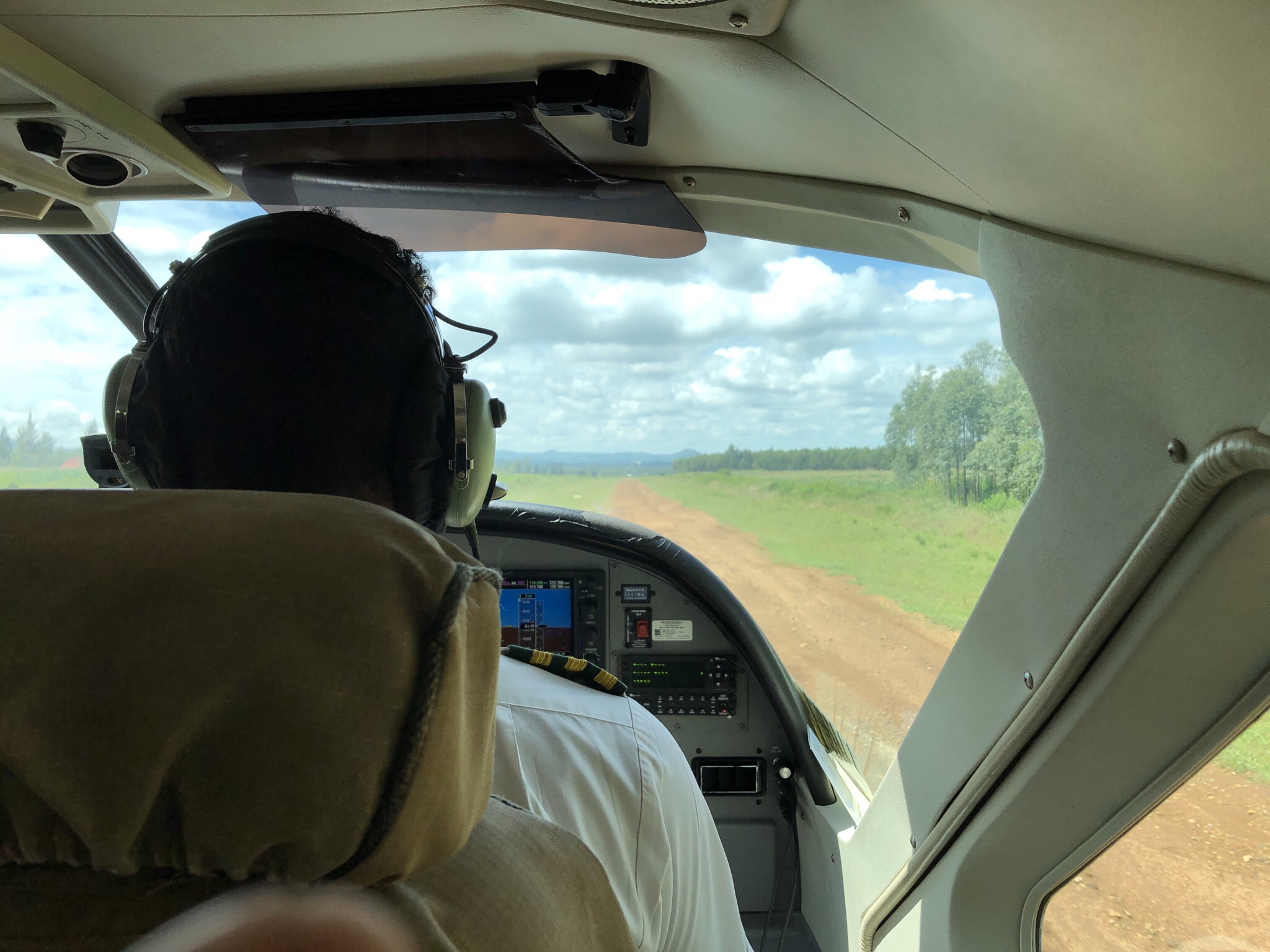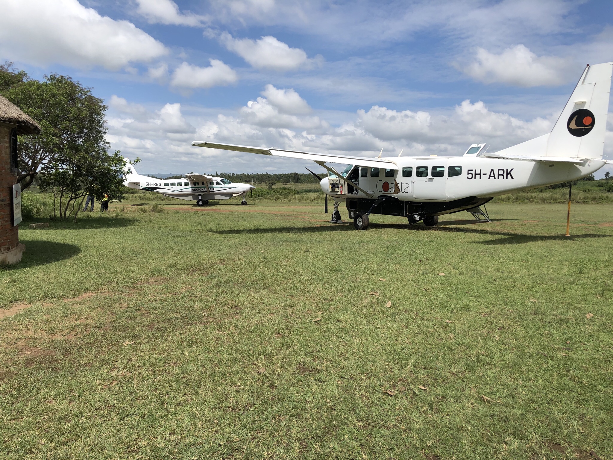 Once we departed from the Tanzanian border town ( the Kenyan and Tanzanian border towns looked a lot like true poorer versions of in parts of our country .. but quite green with bougainvilleas and hibiscus and palm trees along with sausage and acacia trees . ), we were asked stop at what looked like a customs check about a few miles from the town . Couple of resplendently clad white suites officials with two gunmen on either side waved us through and we immediately drove off into a dirt track ! We were worried we were been hijacked but after another mile or so we got to our airfield which was dirt strip in middle of green fields of corn . We watched a couple of Crowned Cranes daintily walk around the airstrip with an air of. Government inspectors out auditing . We exchanged desultory notes on the Economy , taxes and political system of Switzerland and India , with the middle aged Swiss couple .
