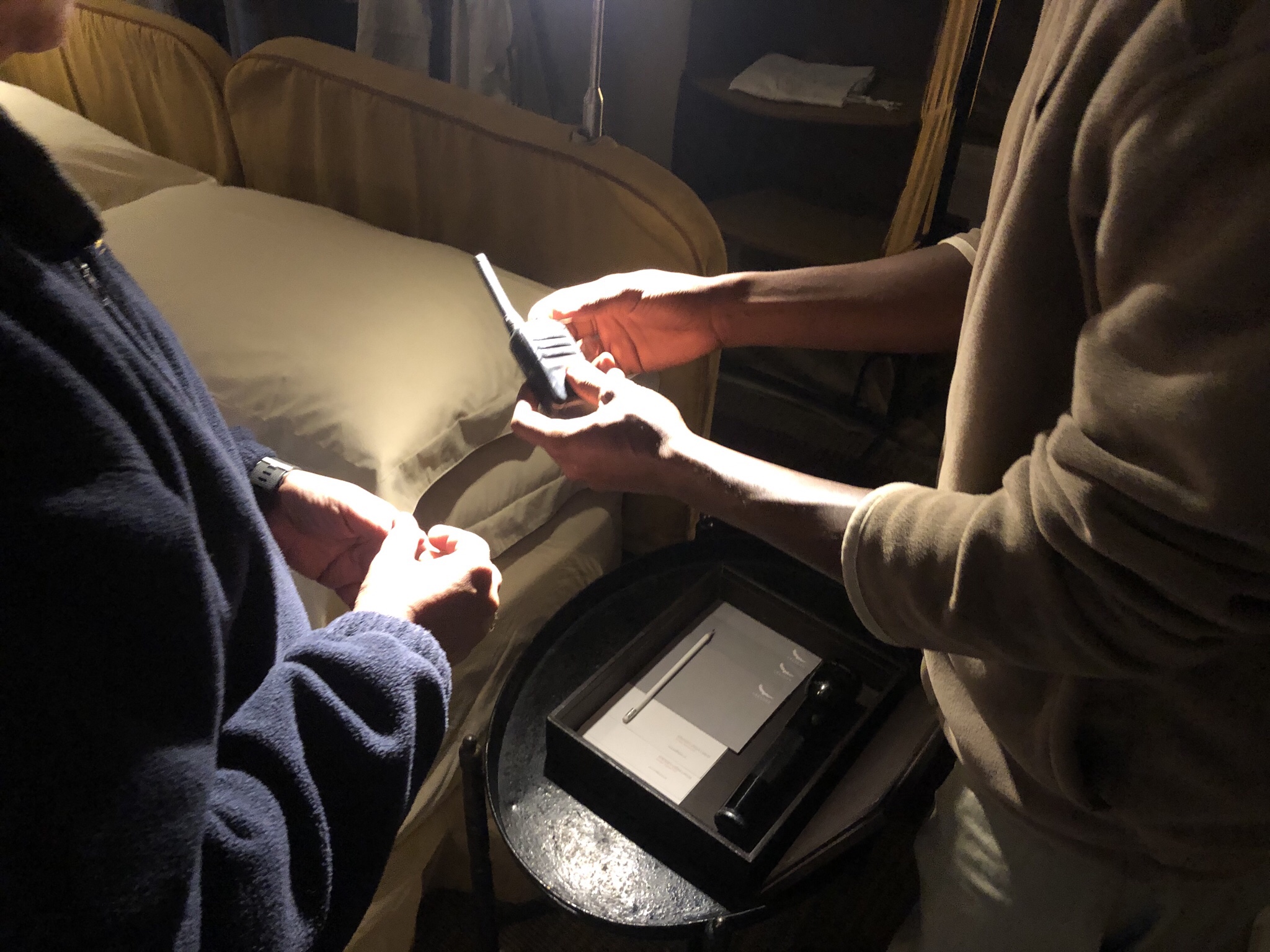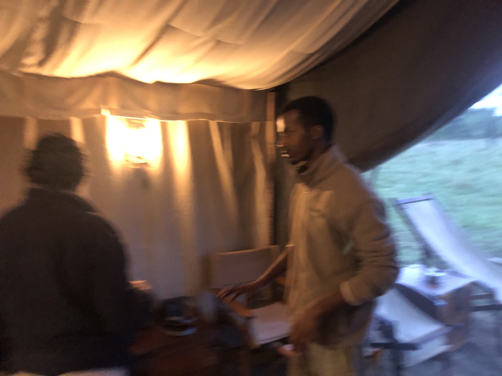 We reached the camp to be greeted by the entire camp welcoming us with a bold rendition of Hakkunah Matata accompanied by handclaps and whistles! After a warm welcome we were introduced to our butler Enok and the camp manager . The camp itself was on a long stretch of grass interspersed with acacia trees and consisted of ten luxury tents . We were at tent number one while an equal number of tents housed the staff , and the main kitchen . The reception consisted of a large tent set up with carpets and sofas to sink in , low tables with candles and books and a large bar . There was a charging station where one could charge ones phones and cameras . The other large tent was the restaurant space . A camp fire place for a communal bonfire on the grass outside completed the picture .