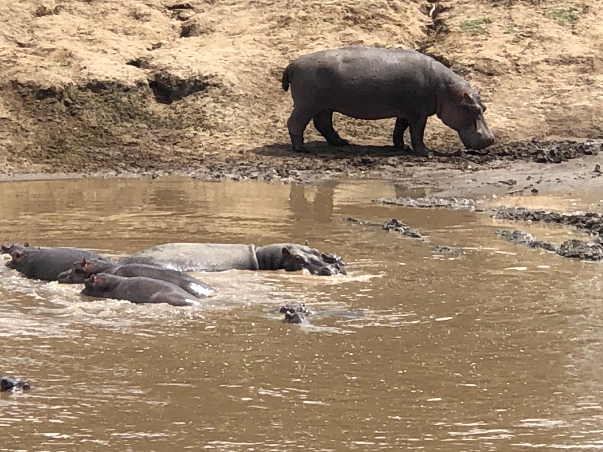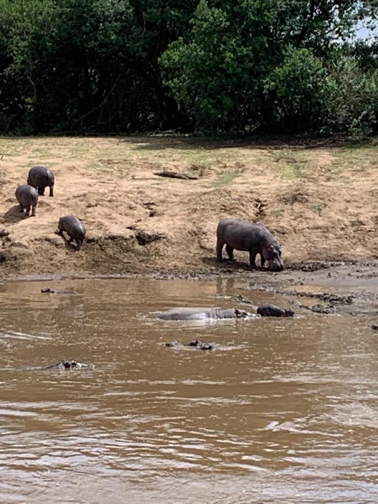 We then drive to the Mara river to see wide bend in the river , where the Wildebeest crossed , at great peril for the place was full of danger . We stopped frist at a wide hippo pool full of noisy hippos and huge Nile crocodiles . We were told to be very careful . A Masai guard was at hand to explain about the hippos . An African fish eagle toiled to get catfish which are to be found in abundance in the river . A grey heron and a yellow billed stork hunted for them too on the rivers edge . The hippo opened their jaws from time to time and some got up on to the bank looking for fresh grass . The hippo don’t fear anybody and because of their short sightedness , their aggressive instincts are greatly feared . More humans are killed by Hippos then by other predators in Africa , we learnt .