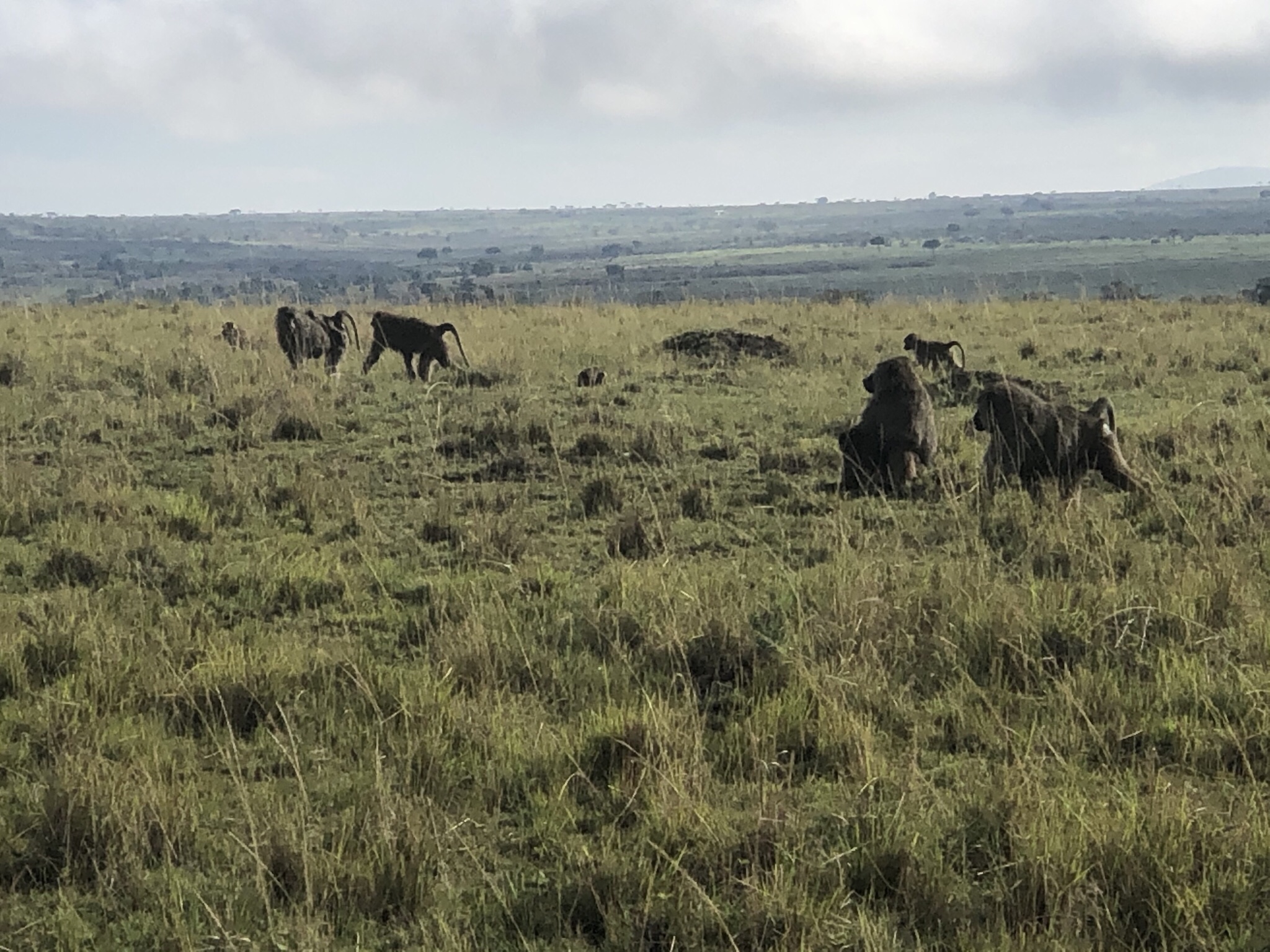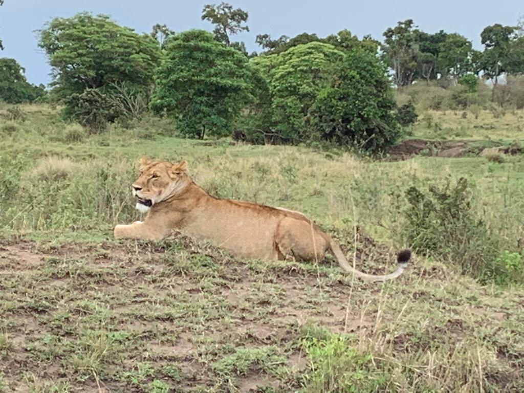 Soon we started tracking another lioness at another part of the wide open savannah . We saw lilac breasted rollers , baboons on the prowl , impalas and Topi’s on the way . On a dry branch , high up , we saw a beautiful Brown parrot which had an emerald green tail .