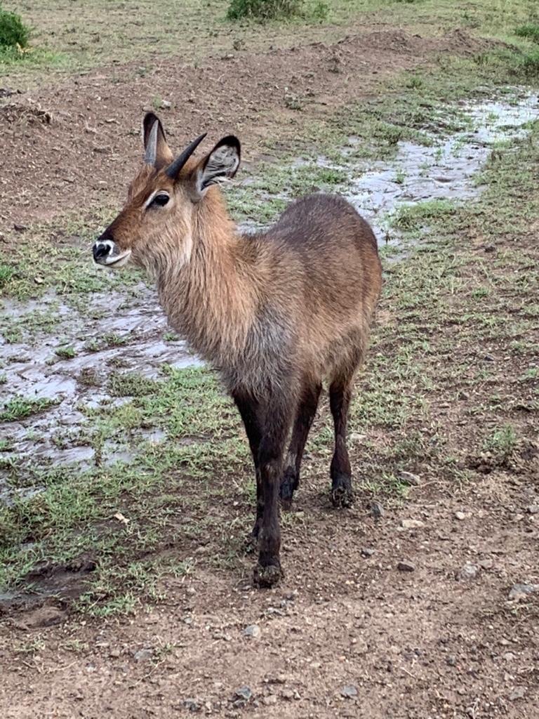We left them and went Black Rhino spotting . We were told that there were only nine black rhinos in the park and they had been reintroduced after their population was decimated through poaching . I am given to understand that they are now thriving . We drive through muddy roads , slip sliding away in spite of the four wheel drive . The two rhinos, a mother and a year plus baby stood blinking with their short sighted eyes about 50 meters away looking completely unworldly . They are just magnificent creatures with two horns , armor plated creatures from a distant past , walking amongst us .