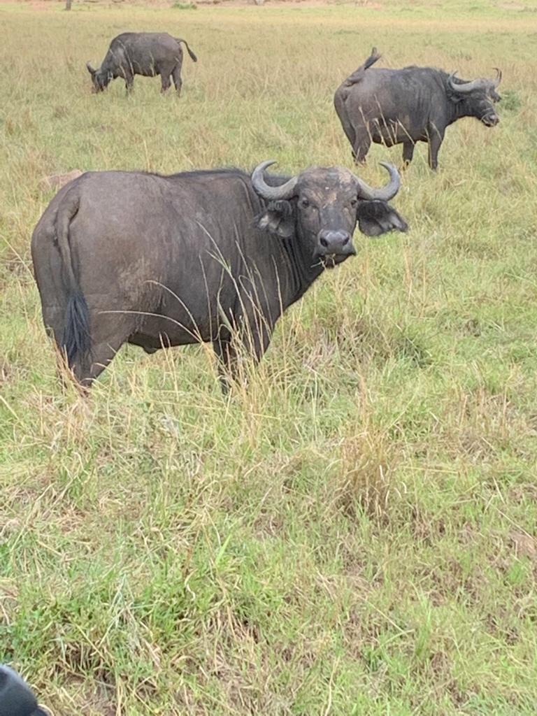 Our vehicles tried to follow the lioness . In the distance I saw two ostriches dancing and feeding . We made our way back as the clouds gathered . A hyena scavenged near the entrance gate of the park , the security guards oblivious to the predator just behind their tents . Then more Cape buffaloes and antelopes , before we finally reached the camp .