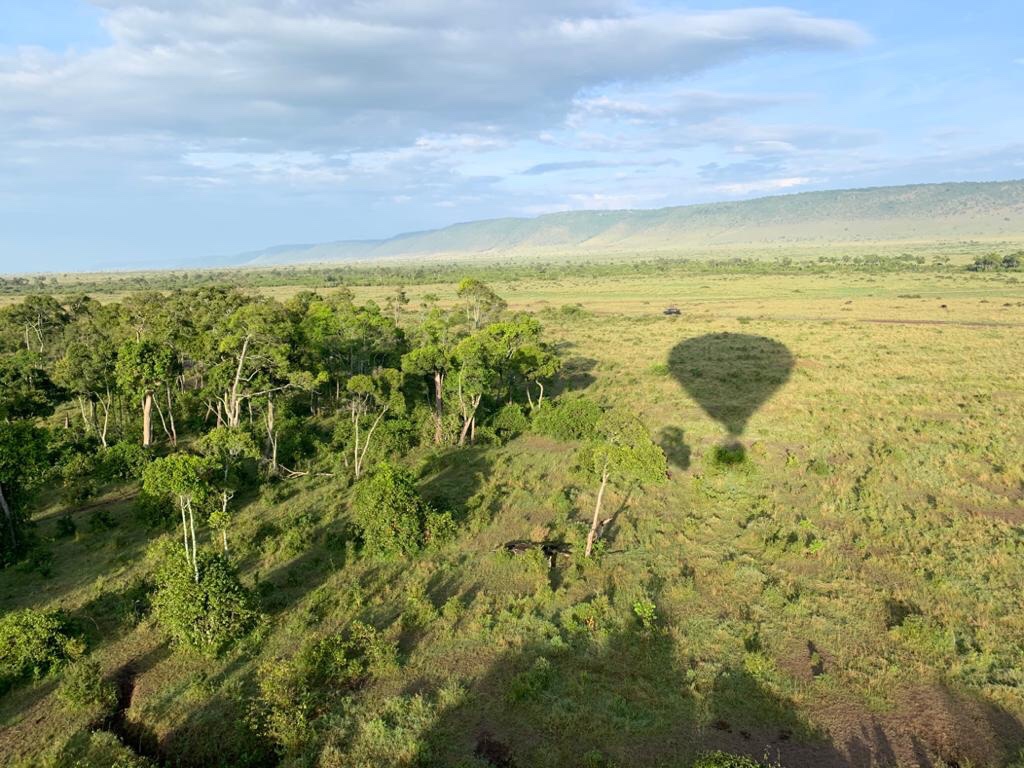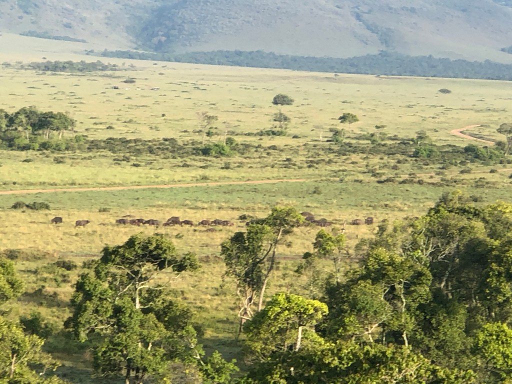 The pilot slowly got the Balloon to drift over th Mara river and soon we saw pods of hippos and buffaloes and giraffes on the ground . The Buffaloes scattered in panic while the birds rose up to fly with us .