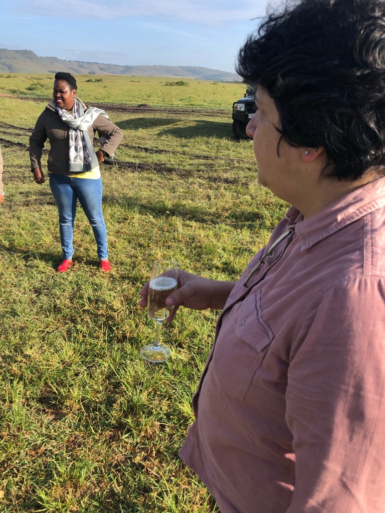 We celebrated our flight with. champagne and were given certificates . While we sat down in that refulgent warm sunshine , we got to know each other a bit better . Turned out that the pilot traveled all over the world flying balloons and he had to leave the next day to see his dying father !